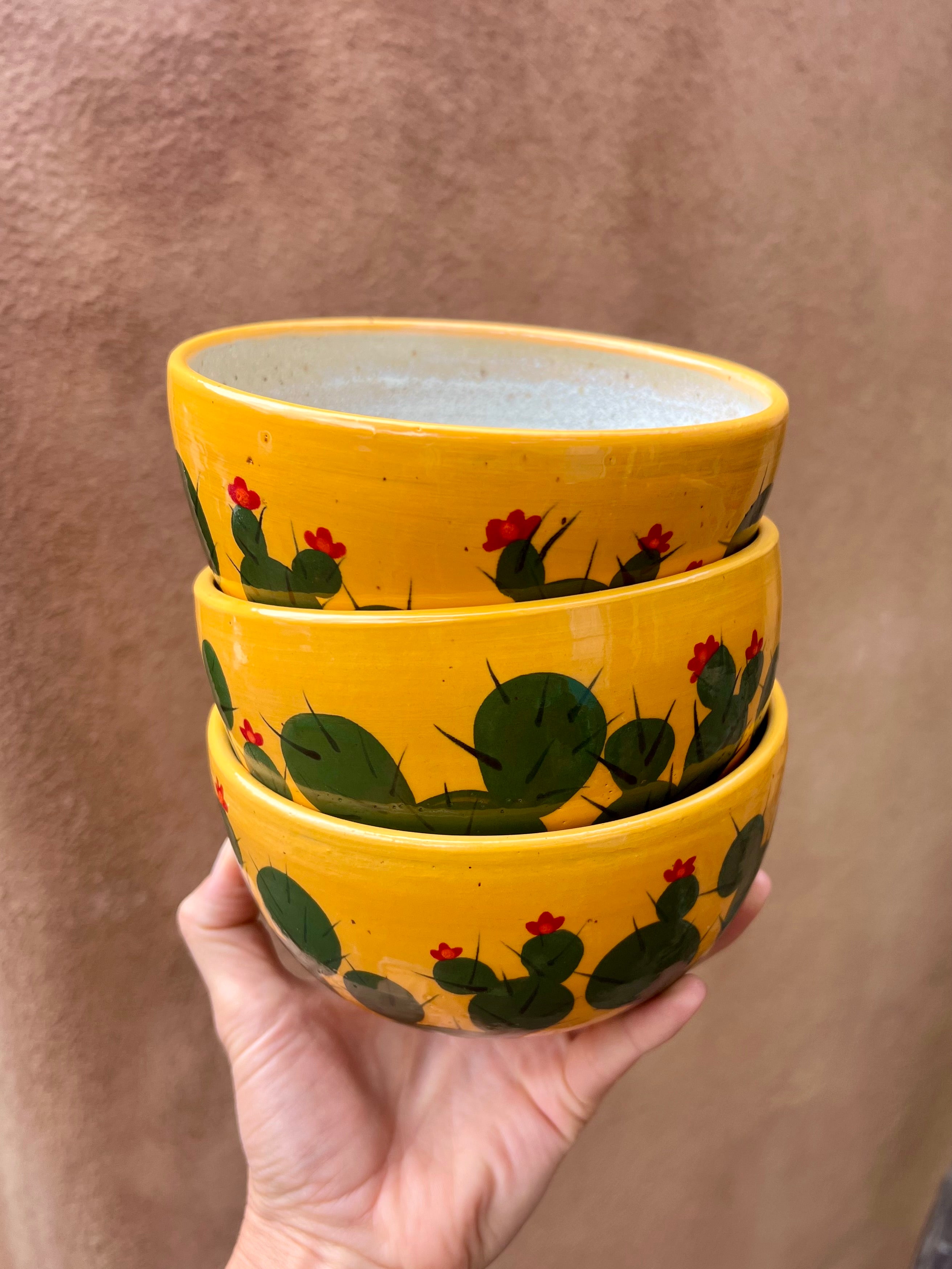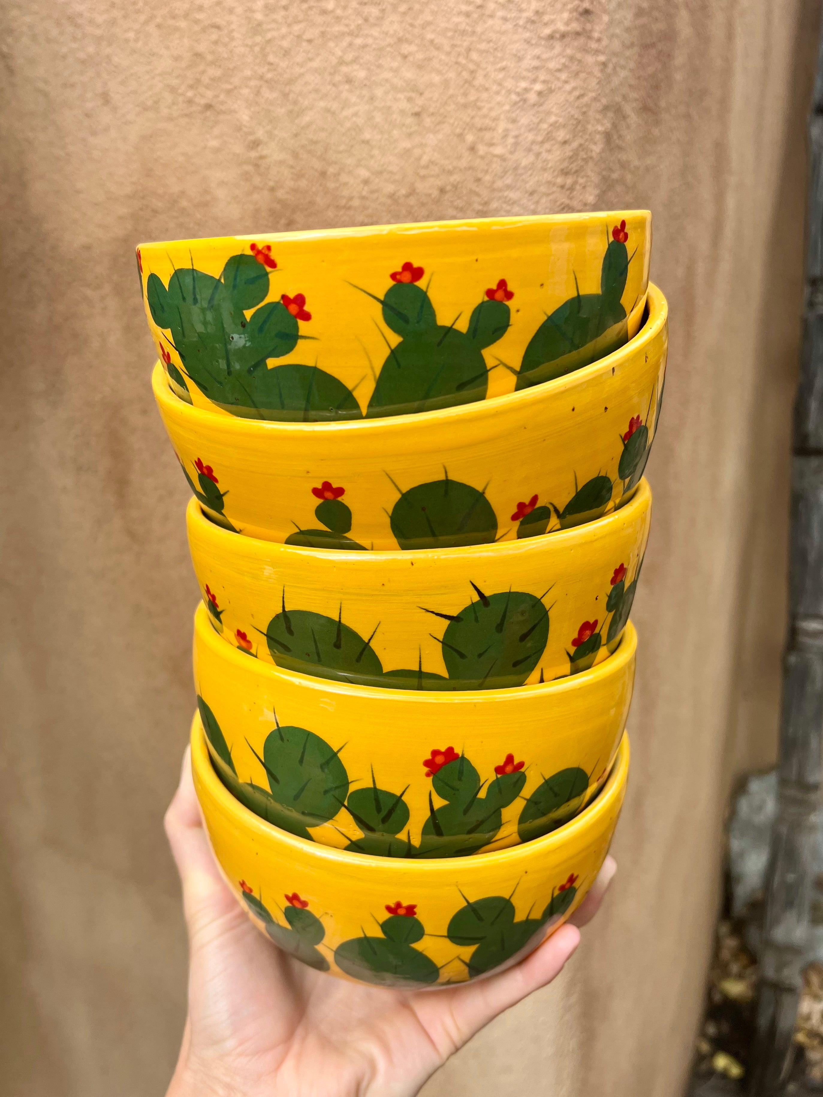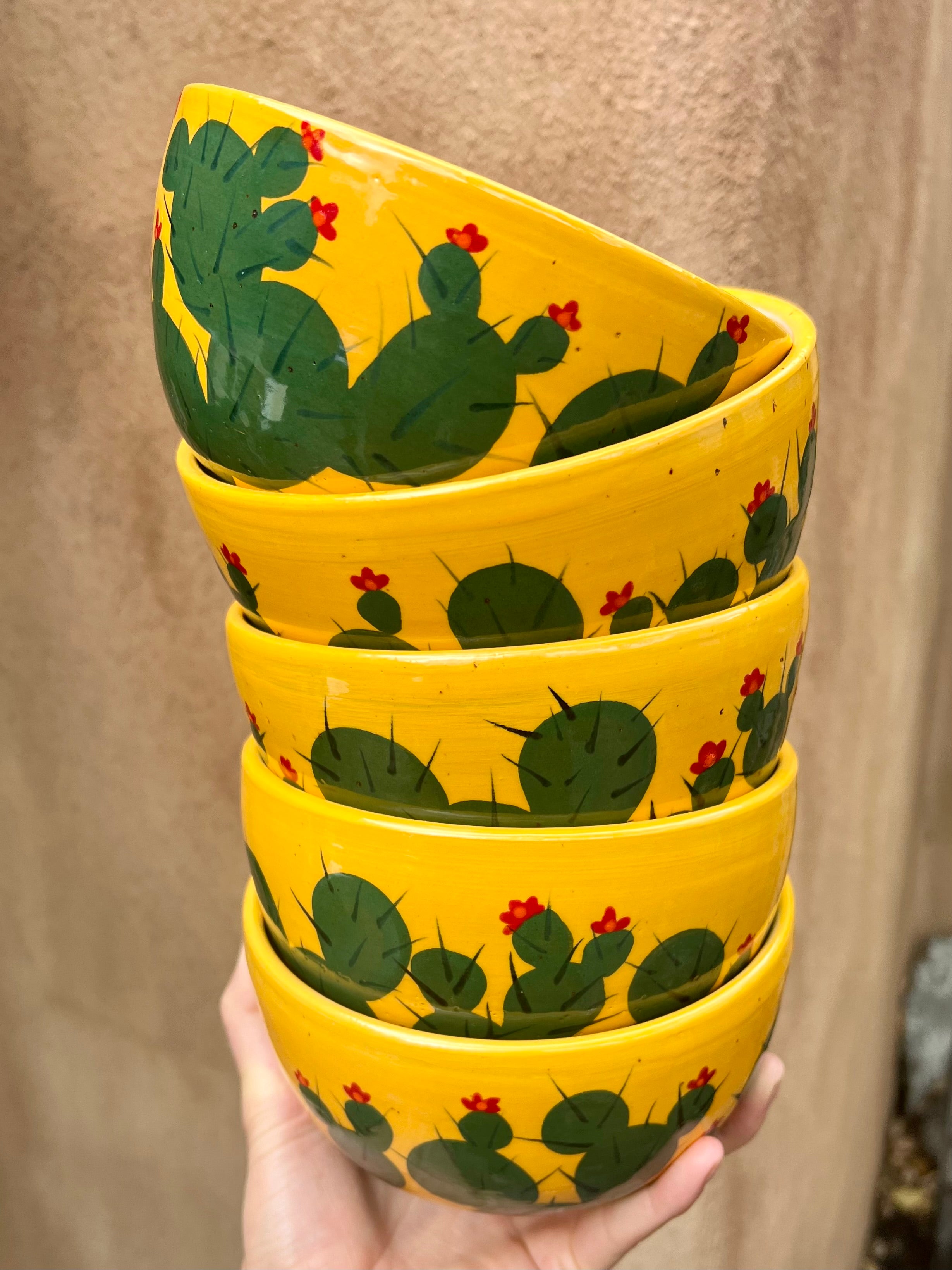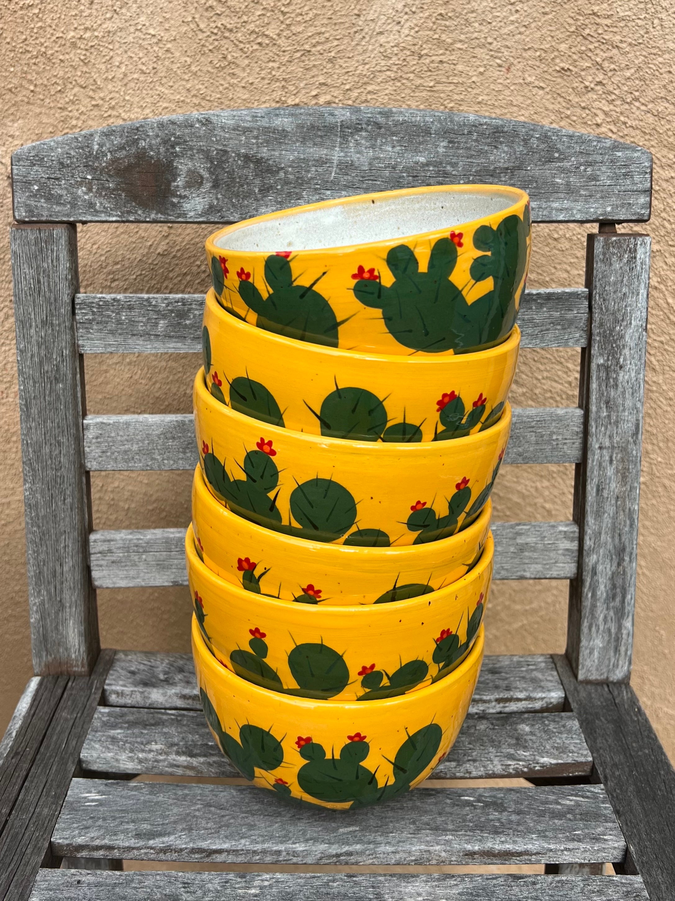 These cheerful, wheel-thrown bowls are painted in a warm golden glaze, wrapped with hand-painted prickly pear cacti in full bloom. Deep green pads and tiny red blossoms dance around the surface, bringing a touch of desert brightness to your table.