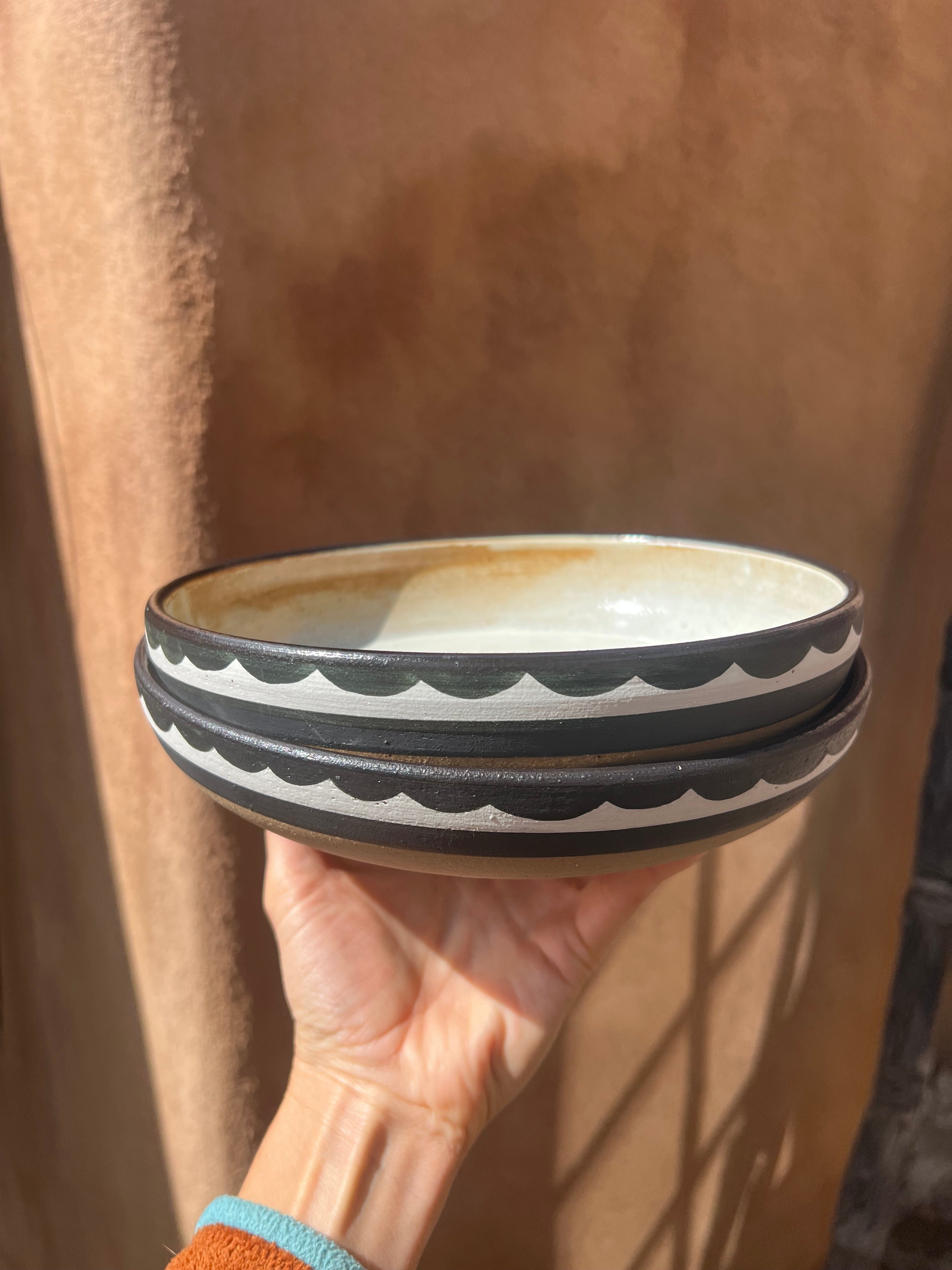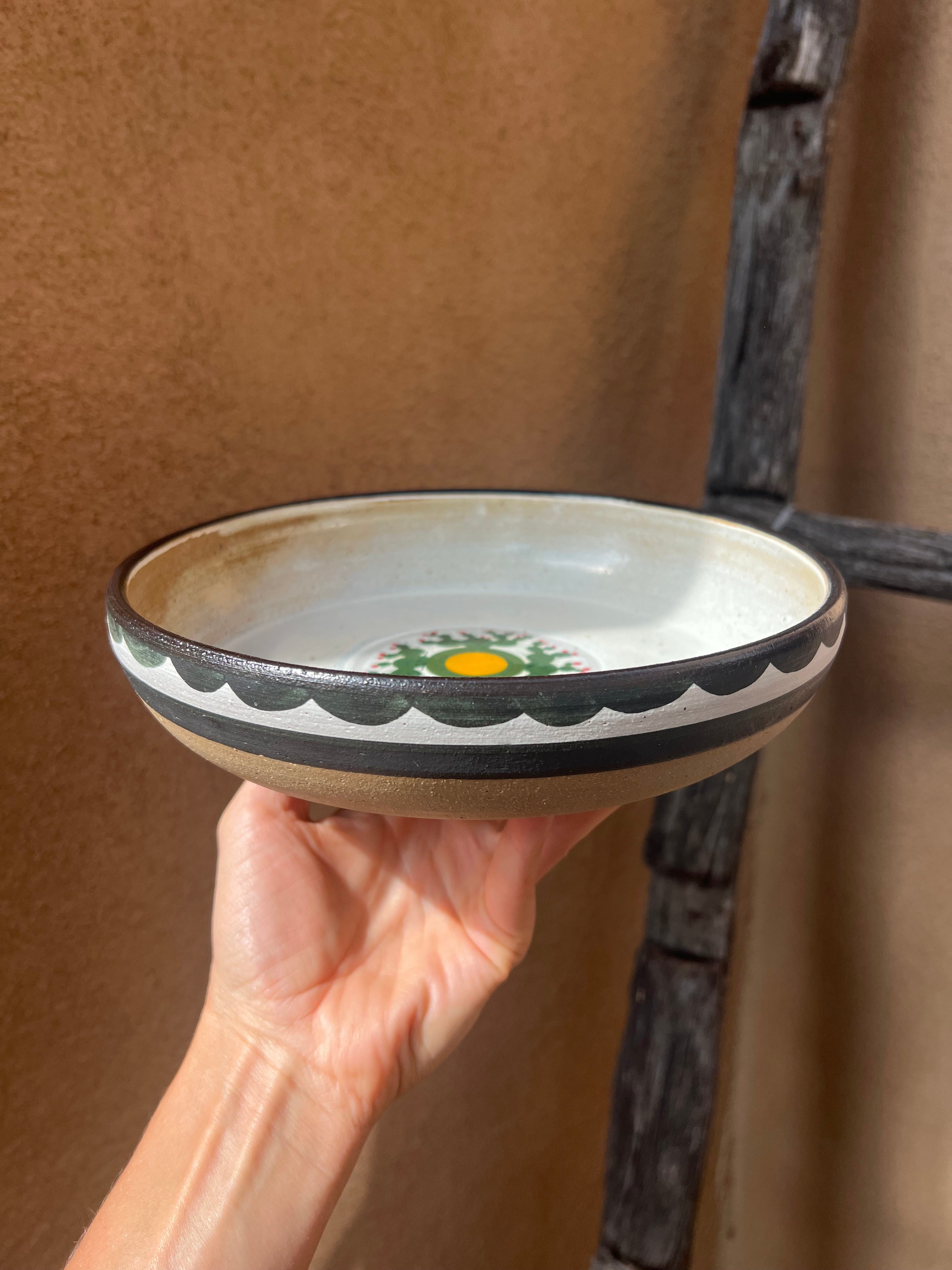 This wheel-thrown stoneware bowl features a hand-painted prickly pear motif circling a golden sun at its center — a little tribute to desert landscapes and sun-soaked days. The rim is decorated with a black-and-white scalloped border, giving the piece a touch of bold, timeless contrast.