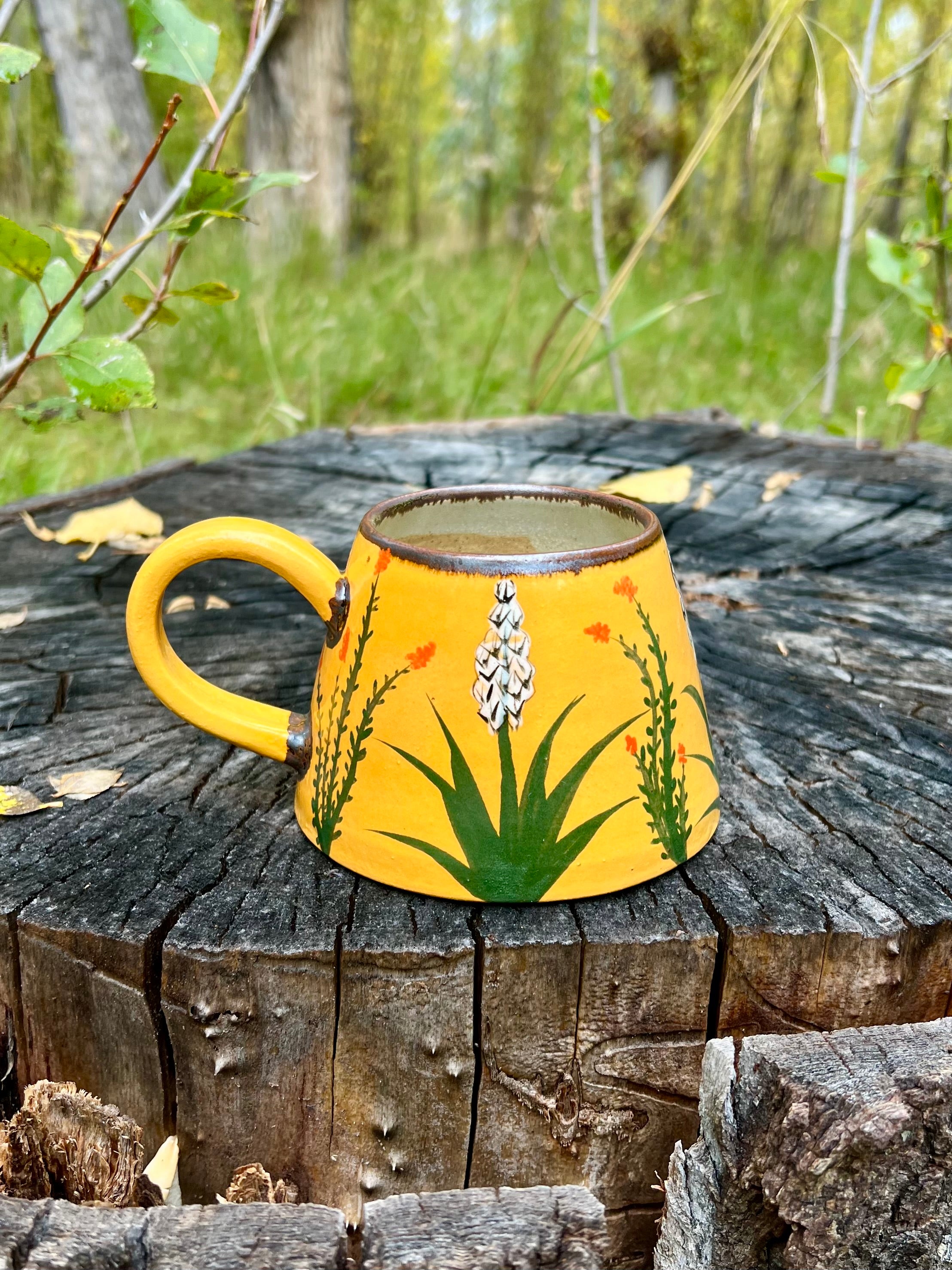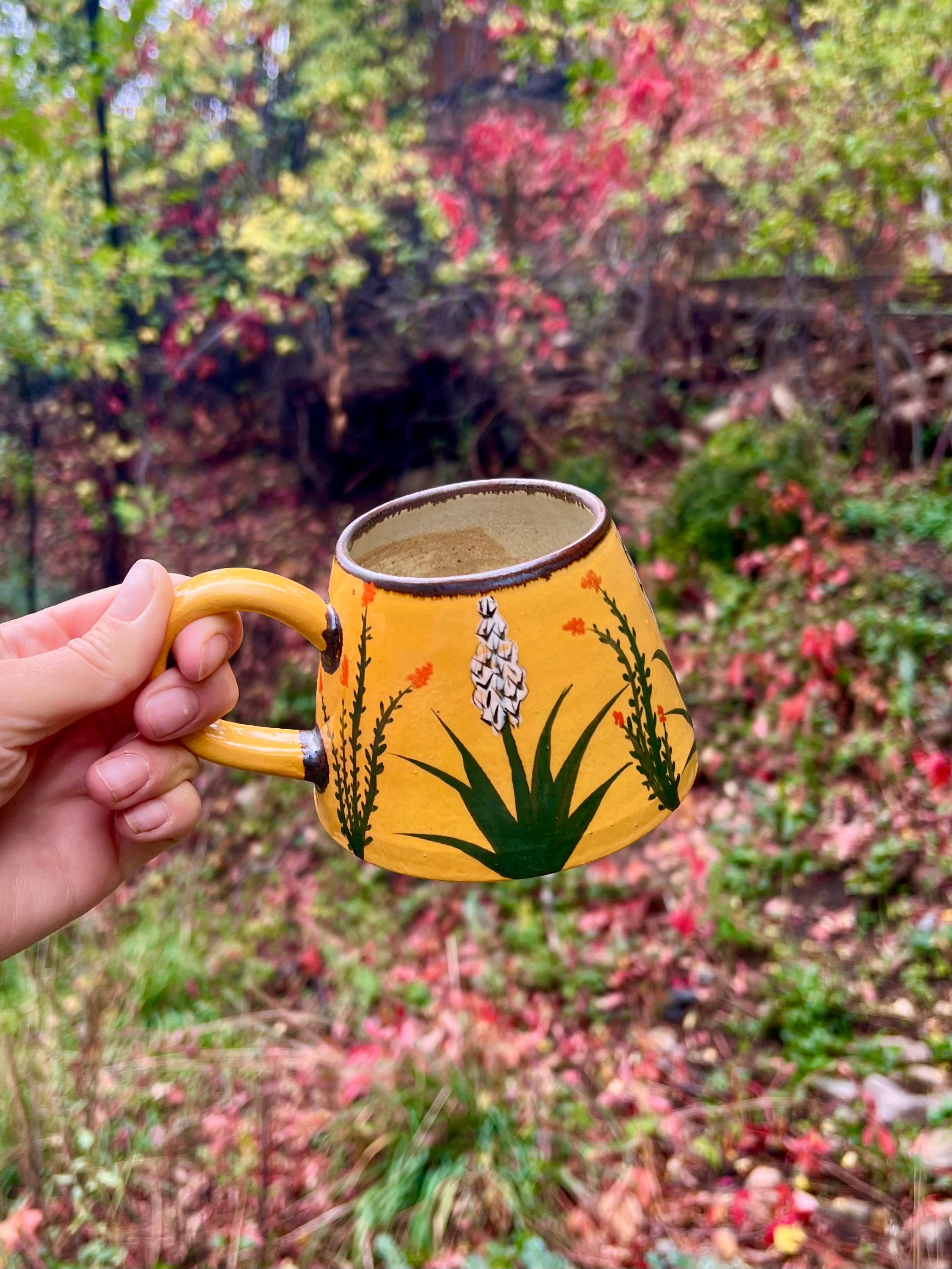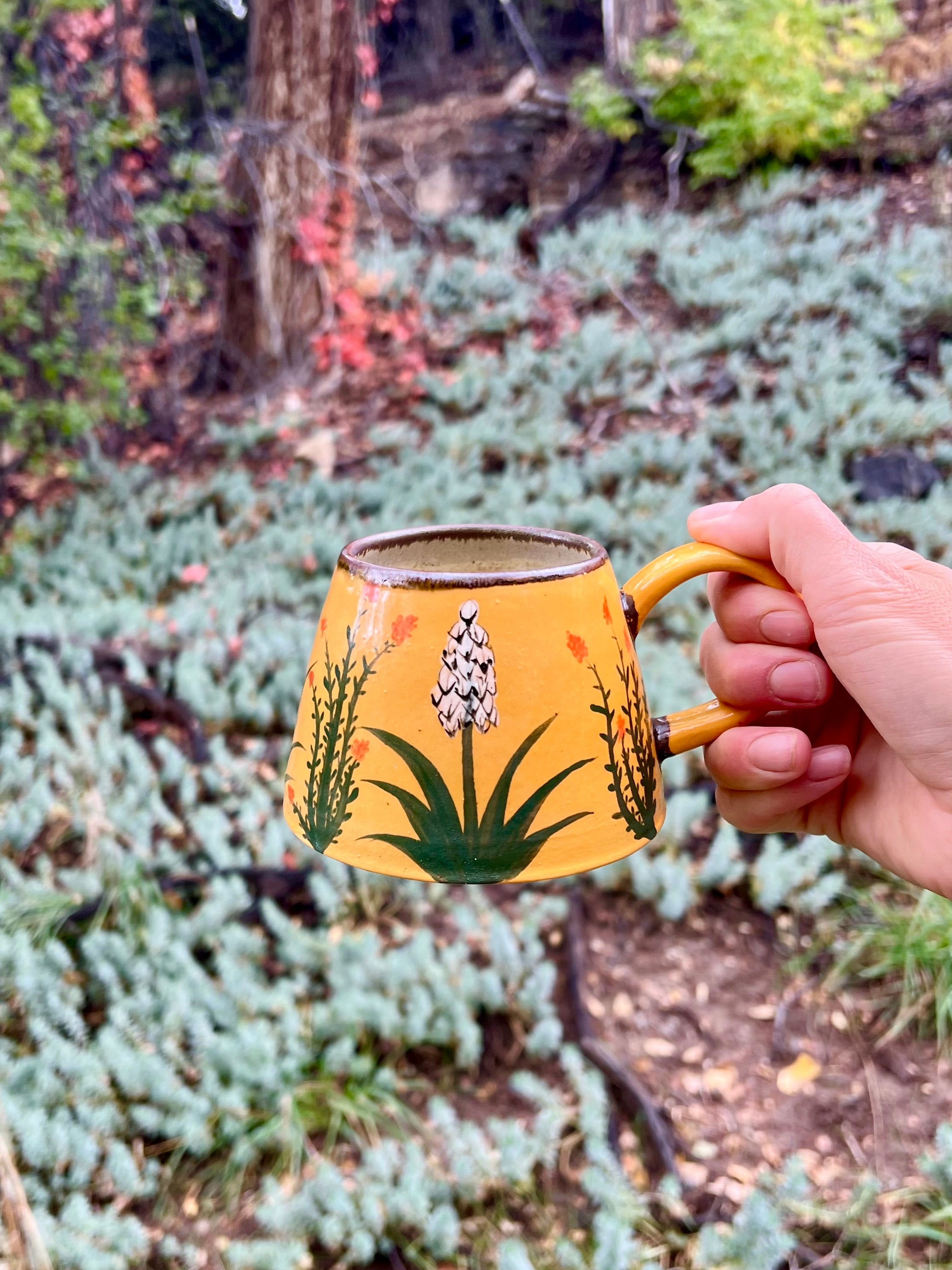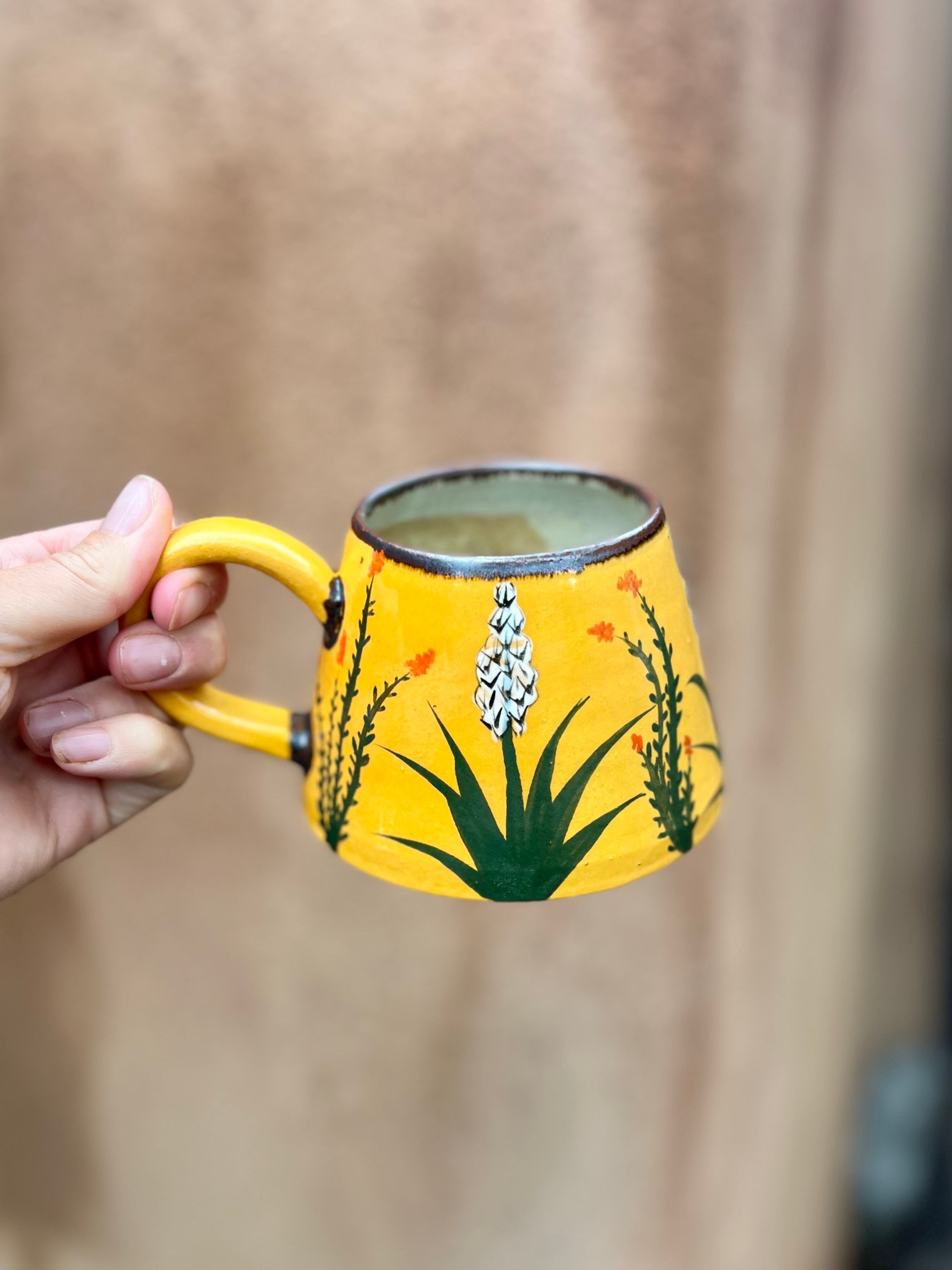 The Golden Yucca & Ocotillo Mug is a hand-thrown, hand-painted ceramic piece that celebrates the beauty of the desert landscape. Its warm golden glaze is adorned with delicate yucca and ocotillo motifs, each brushstroke adding character and charm. The glossy finish enhances the depth of color, while the yellow salt interior glaze brings a subtle, earthy contrast.