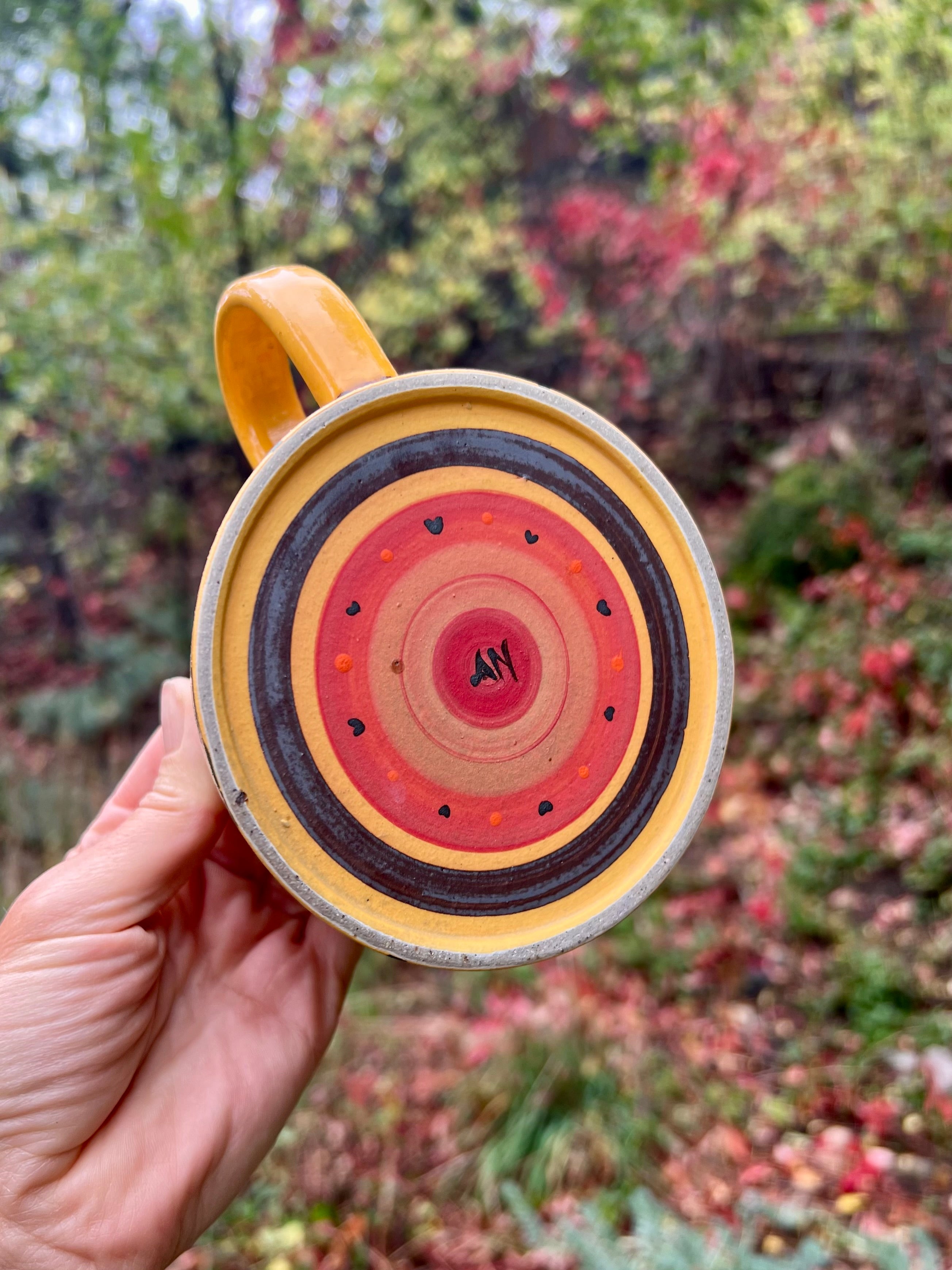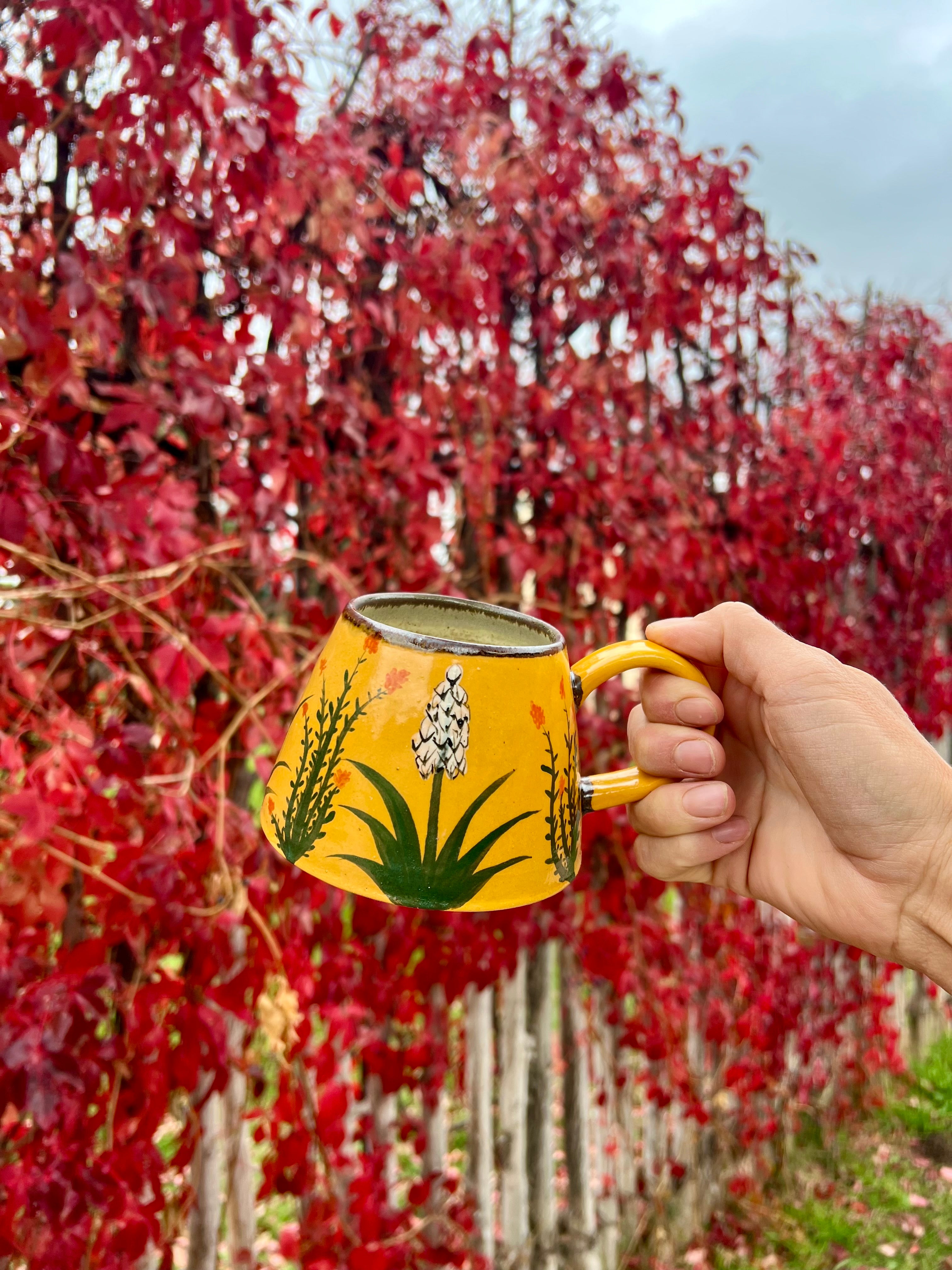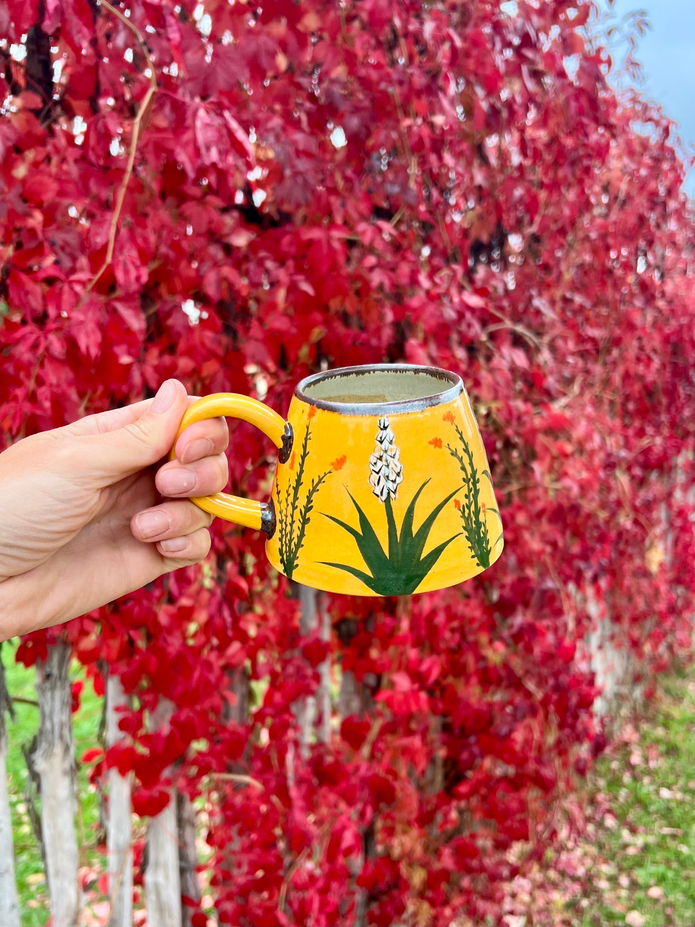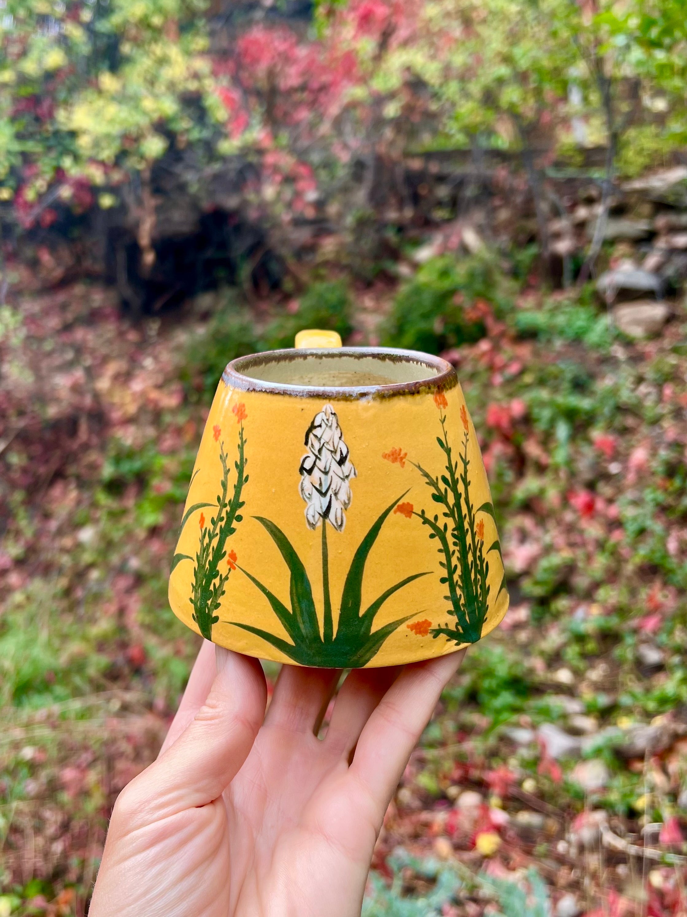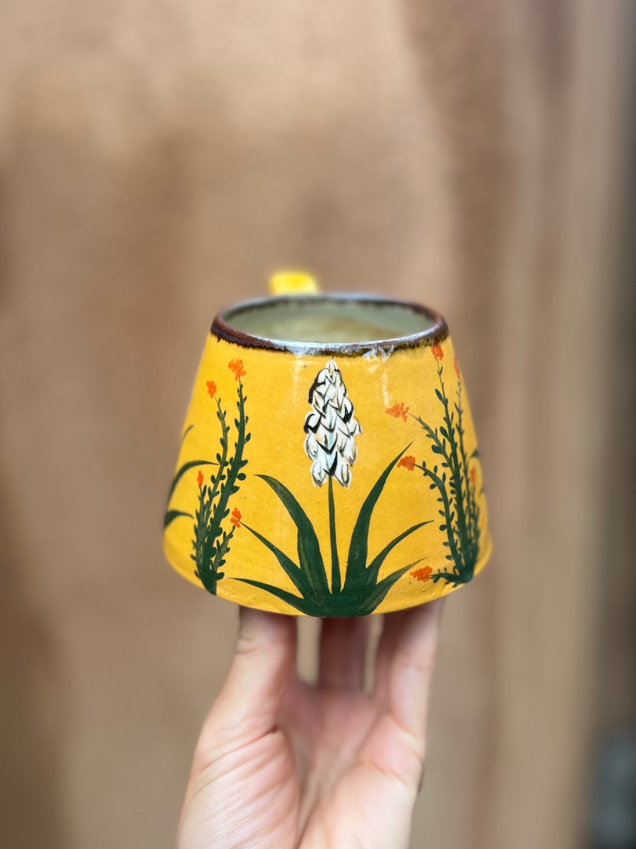 The Golden Yucca & Ocotillo Mug is a hand-thrown, hand-painted ceramic piece that celebrates the beauty of the desert landscape. Its warm golden glaze is adorned with delicate yucca and ocotillo motifs, each brushstroke adding character and charm. The glossy finish enhances the depth of color, while the yellow salt interior glaze brings a subtle, earthy contrast.