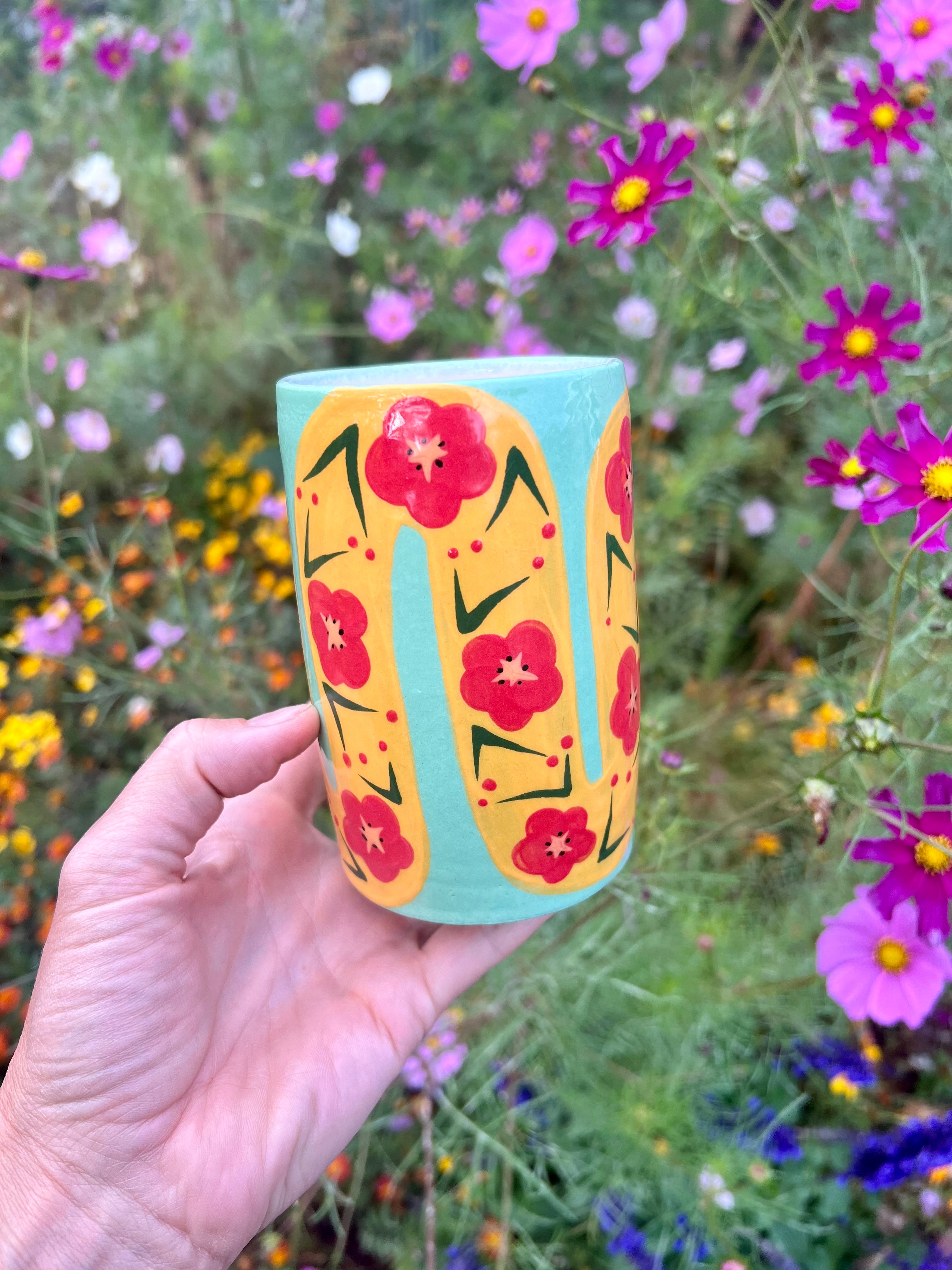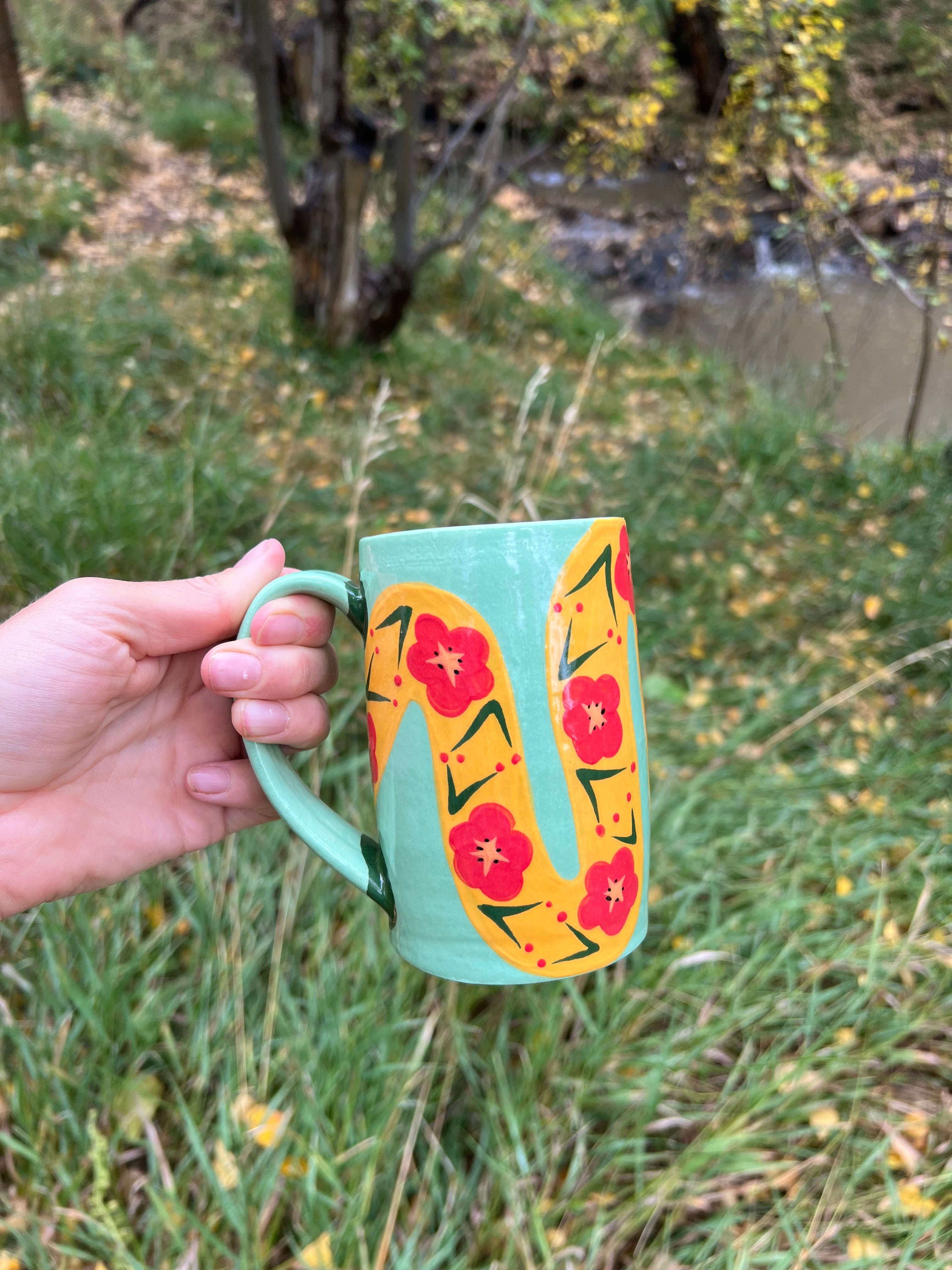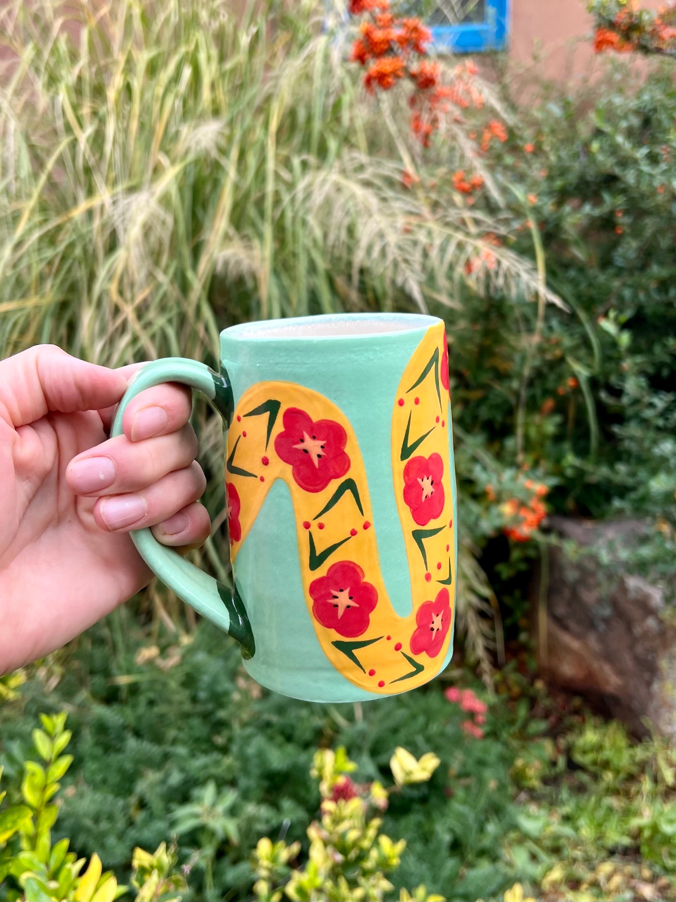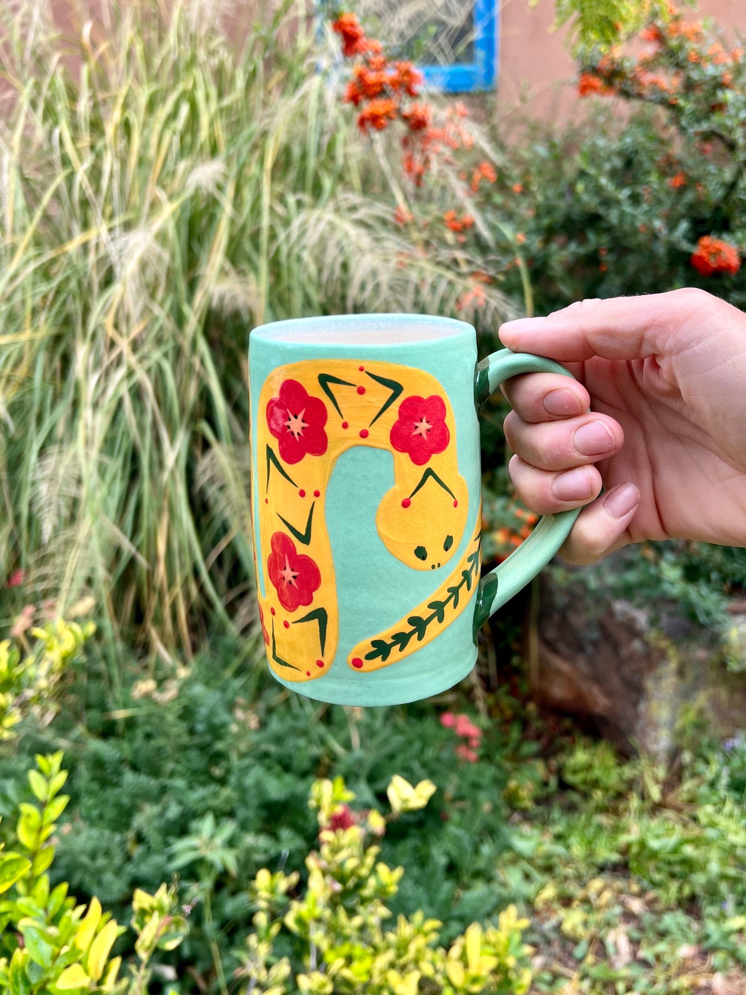 Bring a touch of nature and whimsy to your morning ritual with this one-of-a-kind, wheel-thrown ceramic mug. Its smooth mint-green glaze serves as the backdrop for a hand-painted golden-yellow snake adorned with bright red flowers and leafy green vines — a lively, artistic nod to transformation and beauty in everyday life.