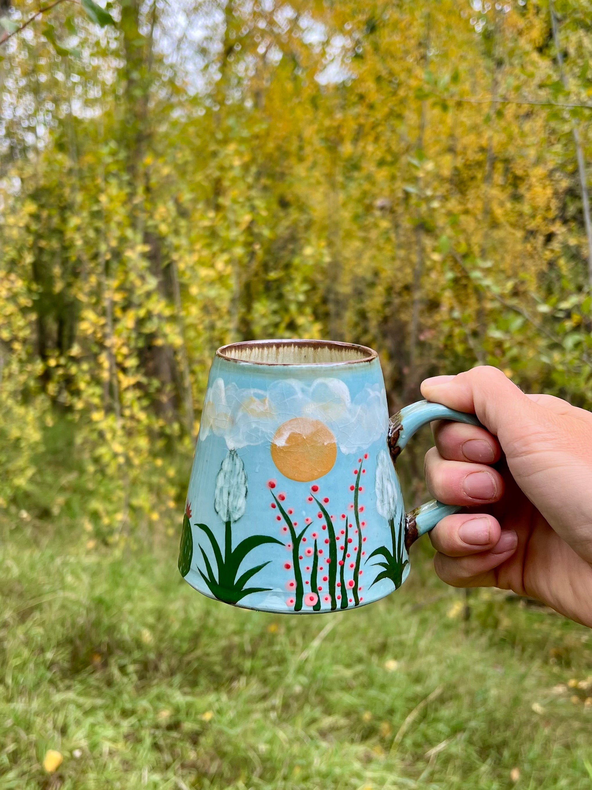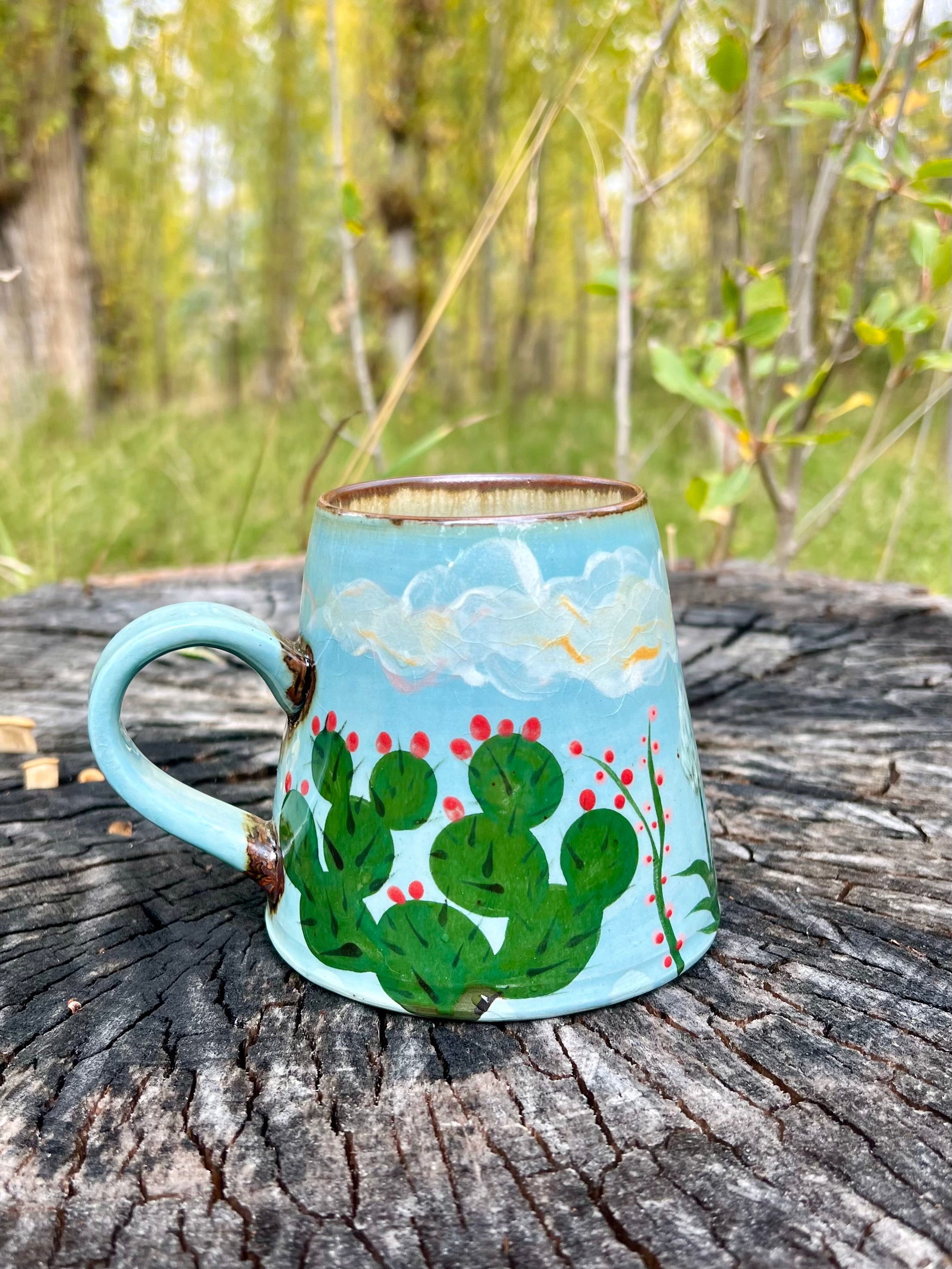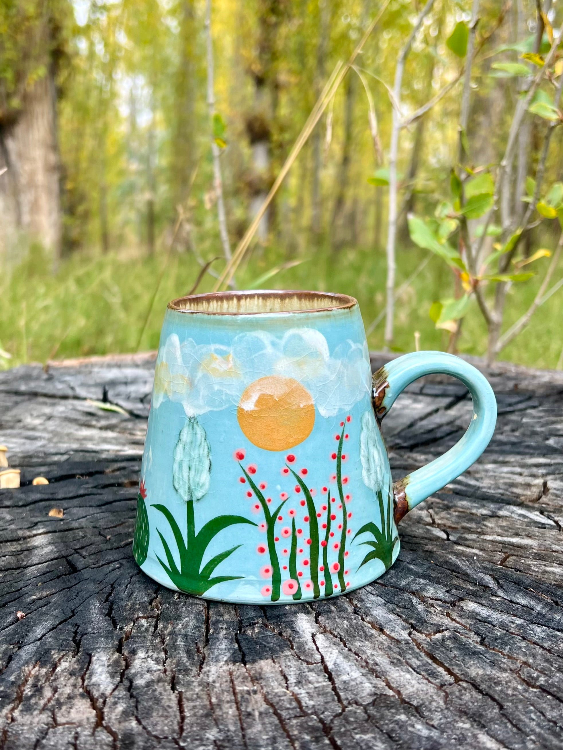 This wheel-thrown ceramic mug brings the beauty of the desert to your morning ritual. Each mug is individually hand-painted, featuring a serene sunrise scene with desert flora—no two are ever exactly alike.