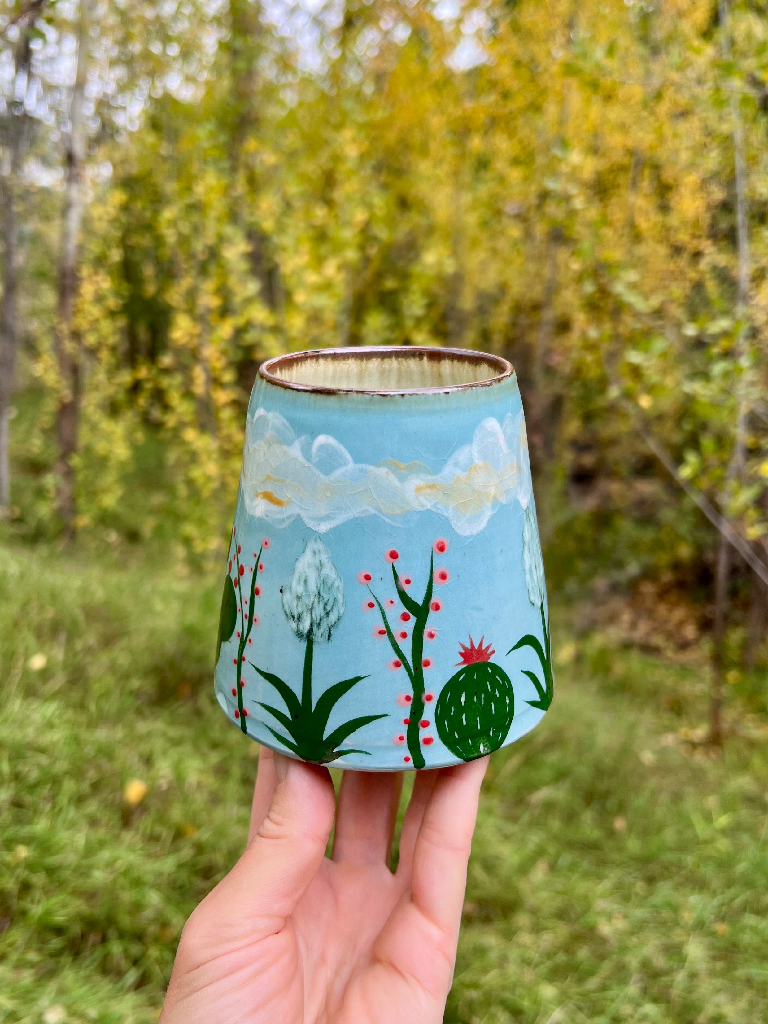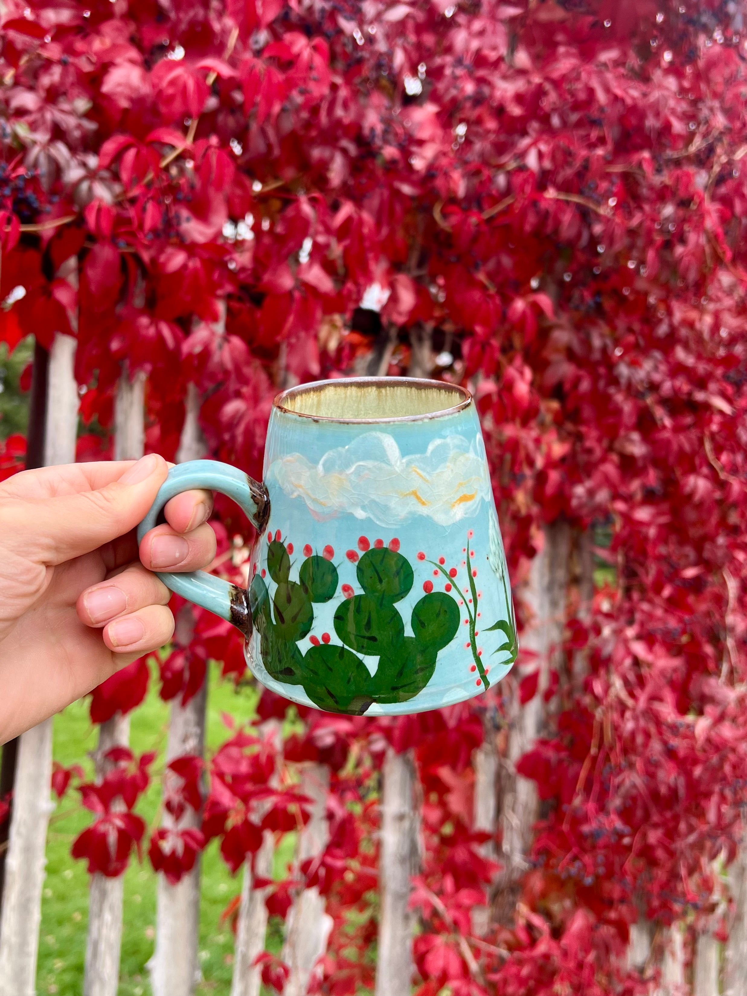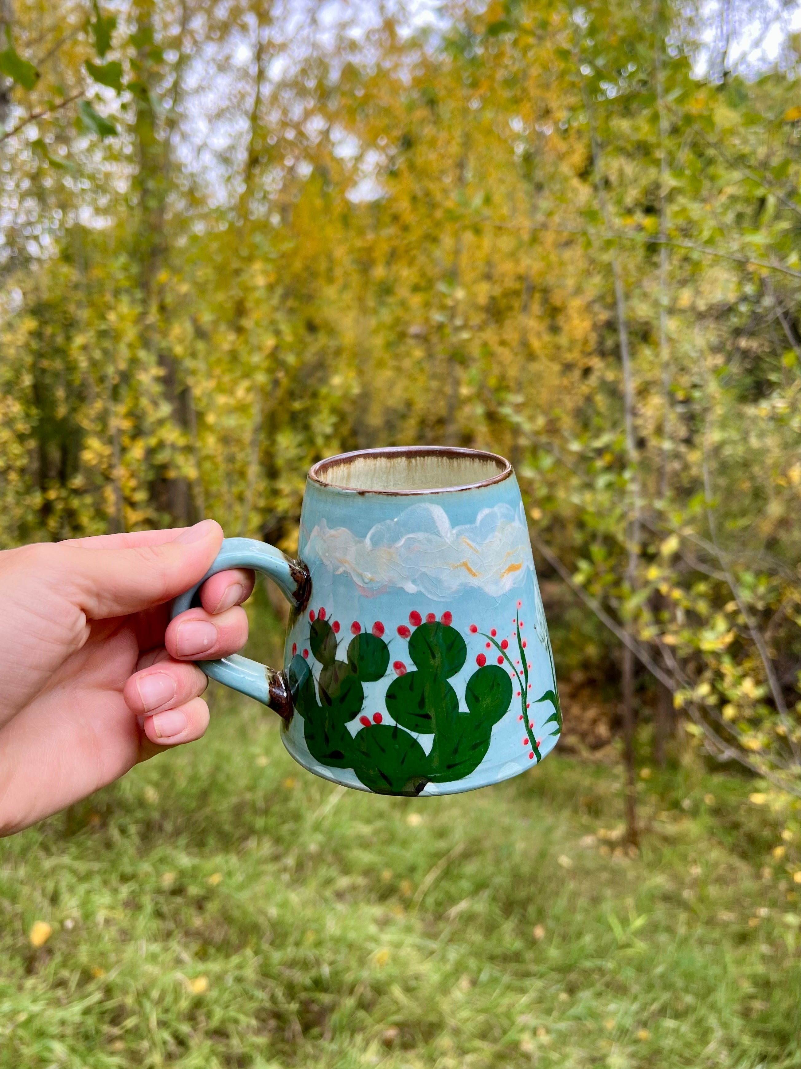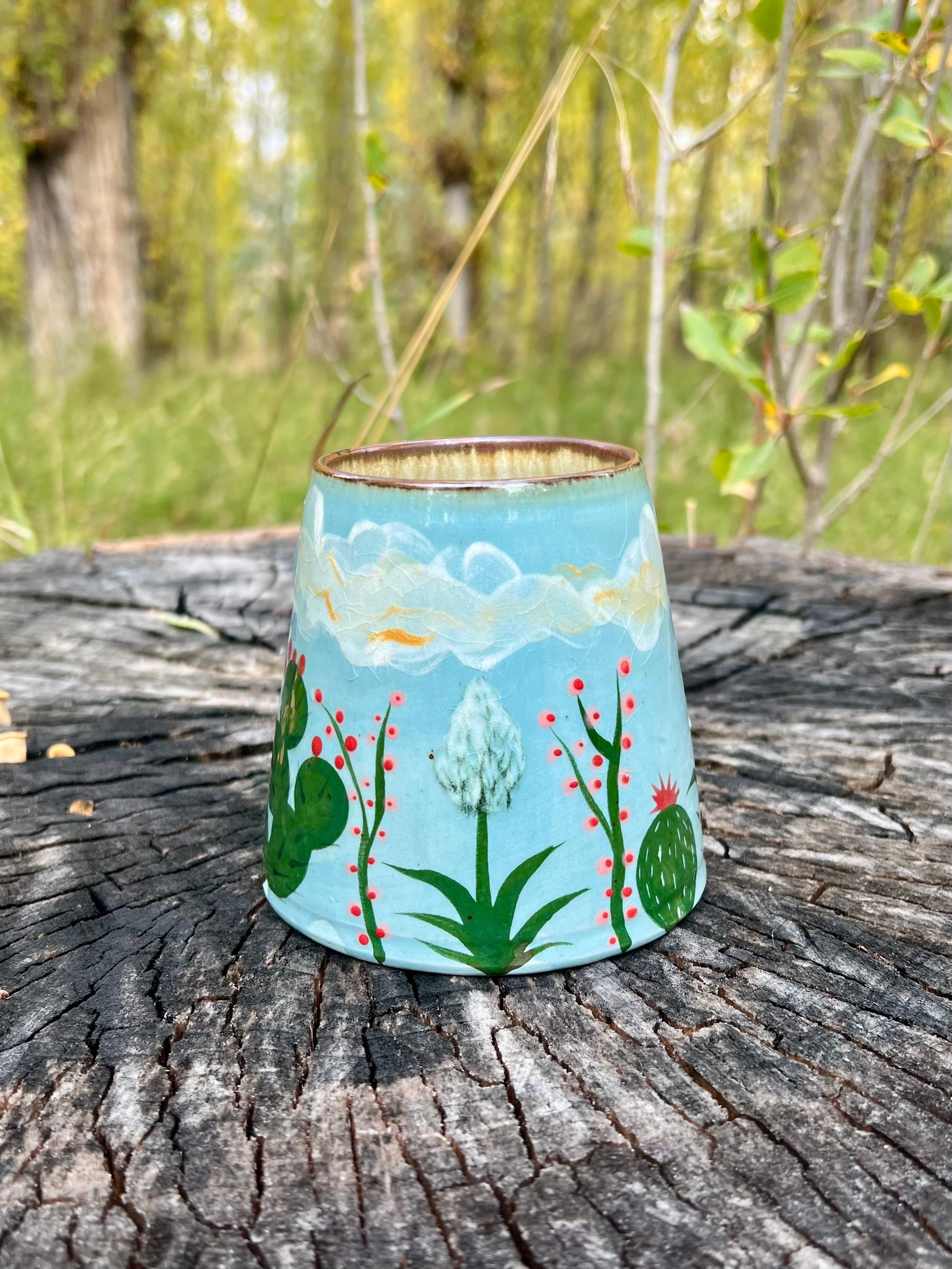 This wheel-thrown ceramic mug brings the beauty of the desert to your morning ritual. Each mug is individually hand-painted, featuring a serene sunrise scene with desert flora—no two are ever exactly alike.