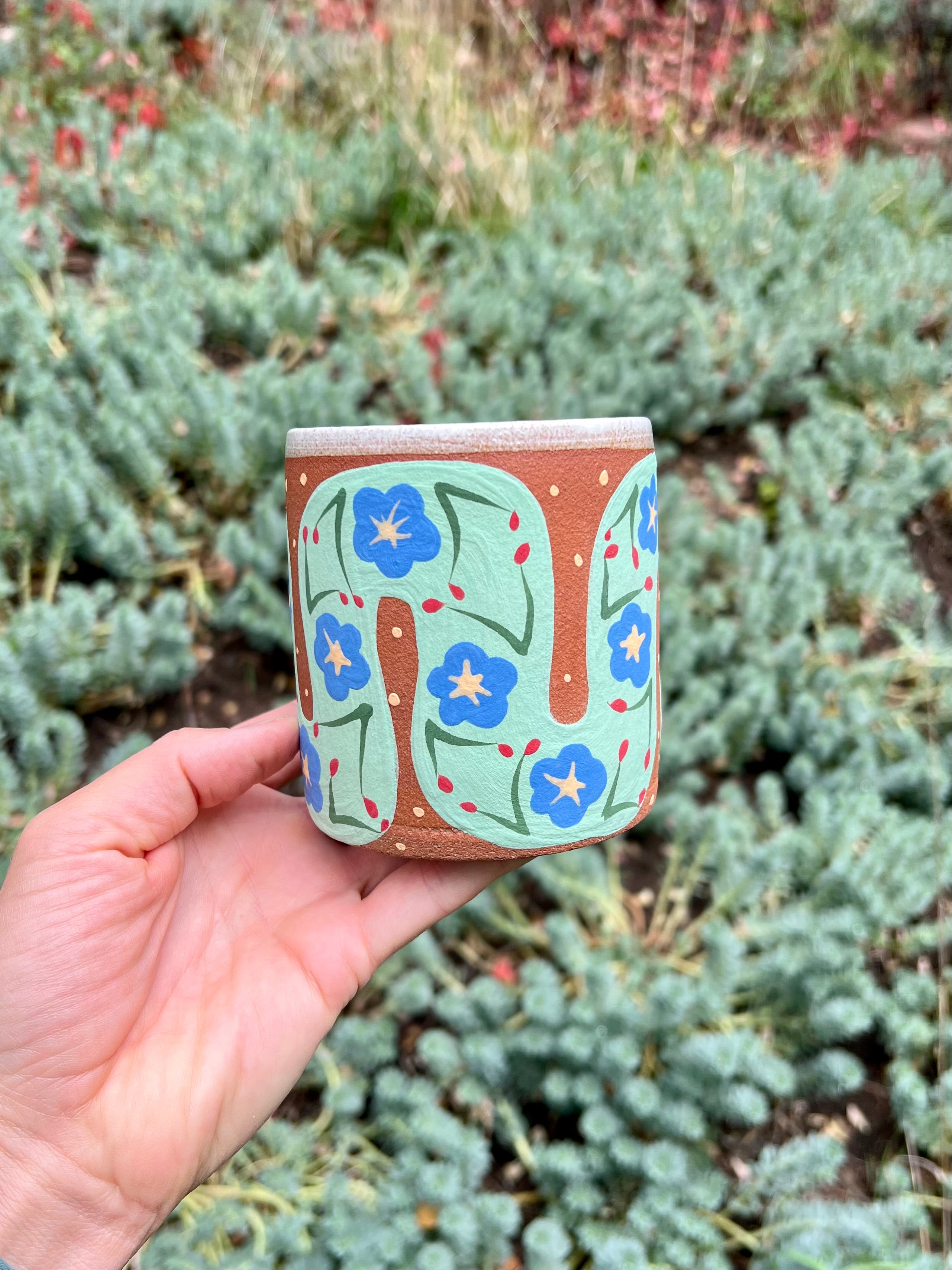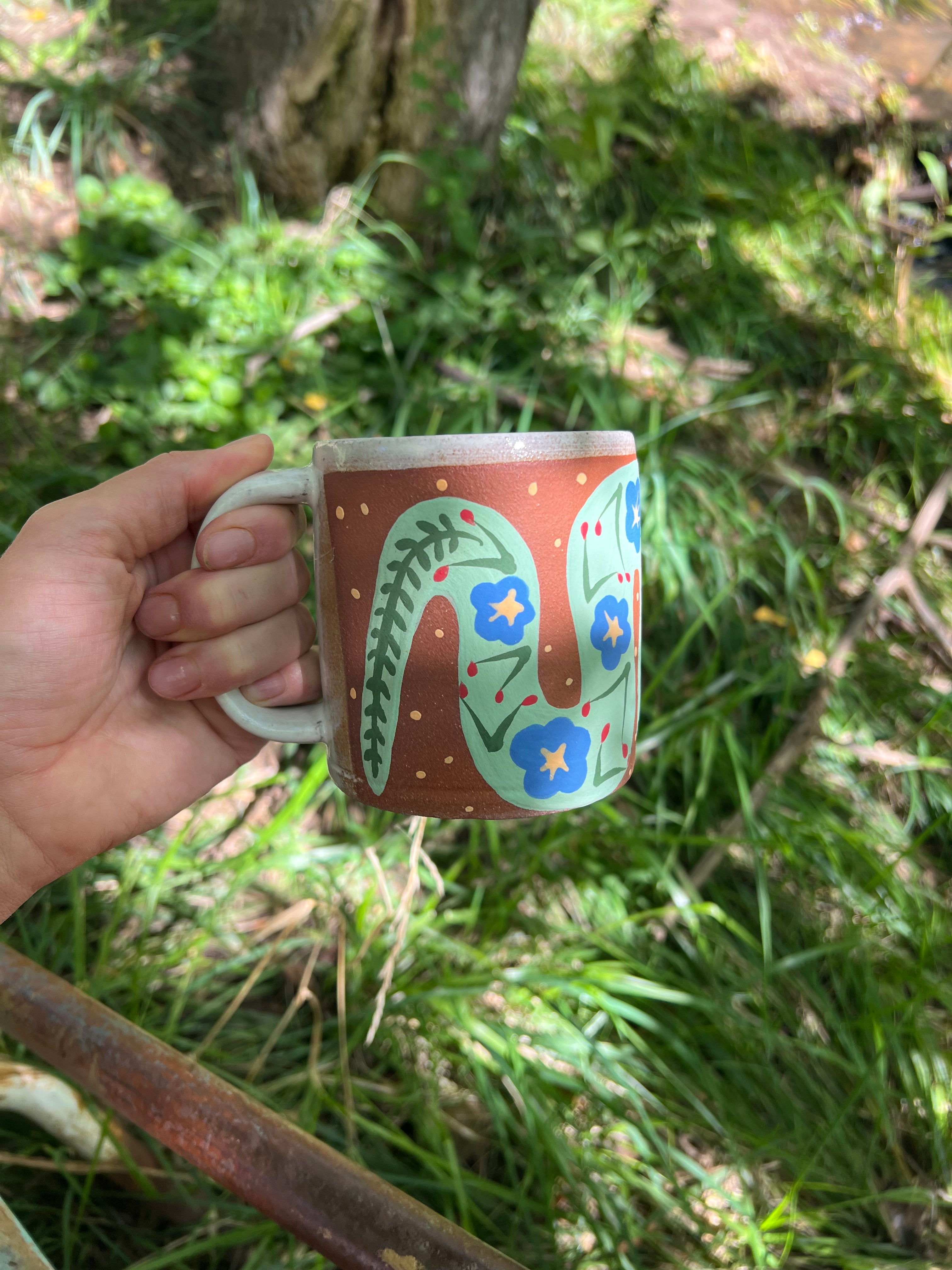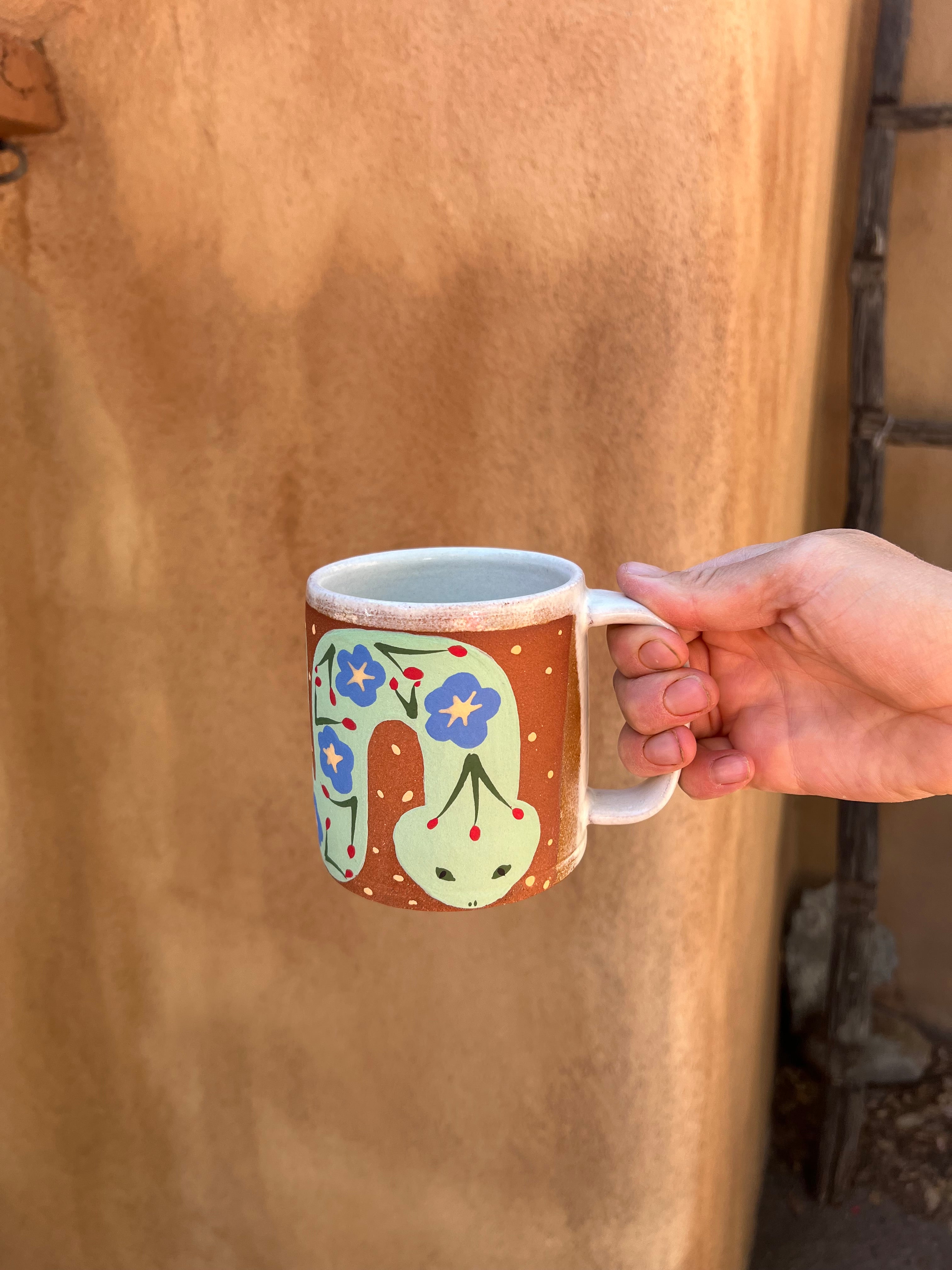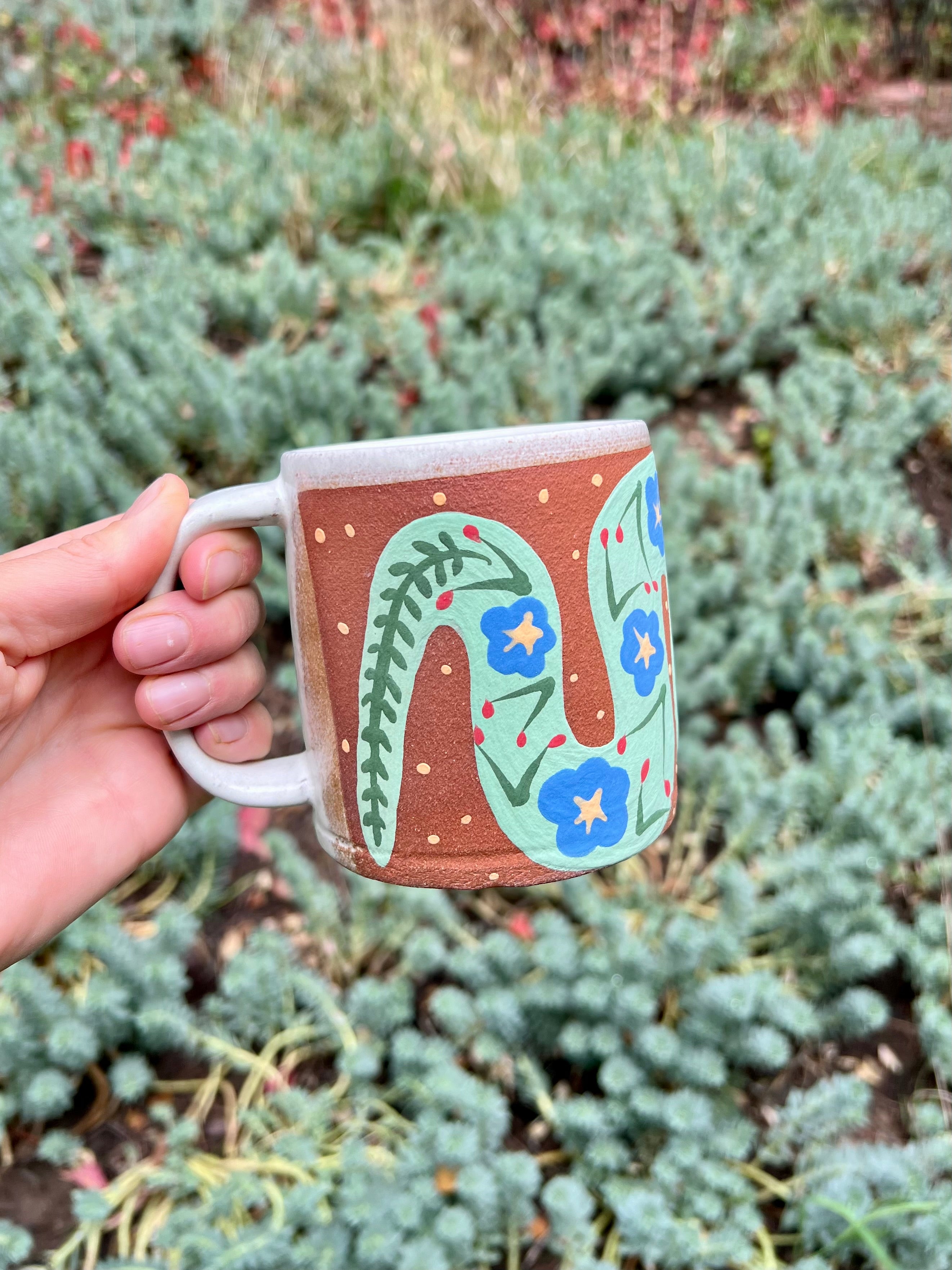 This hand-thrown ceramic mug celebrates the meeting of earth and bloom — a coiled snake adorned with bright blue flowers winds gracefully across the warm red clay surface, bringing a touch of wild beauty to your daily ritual.
