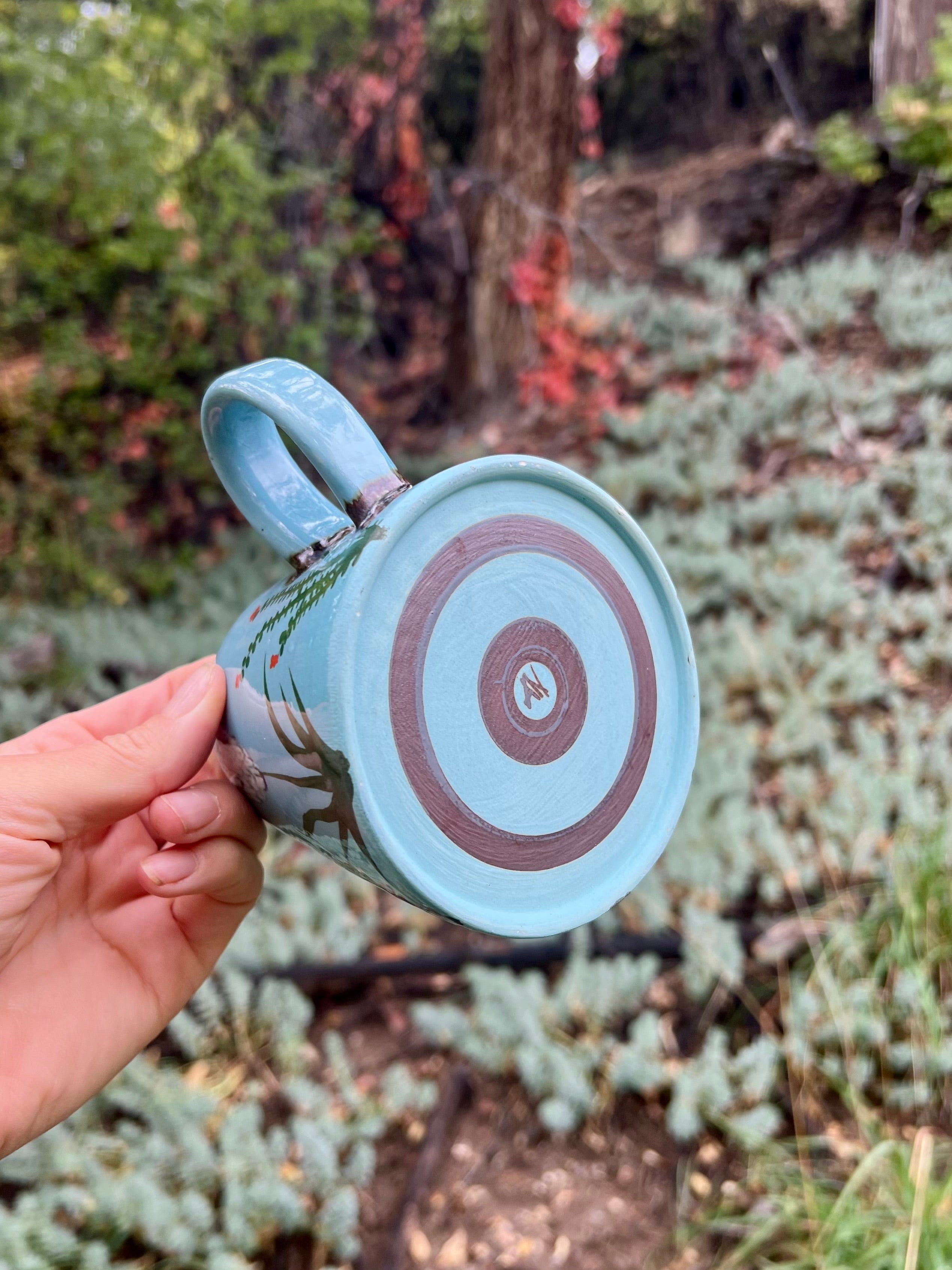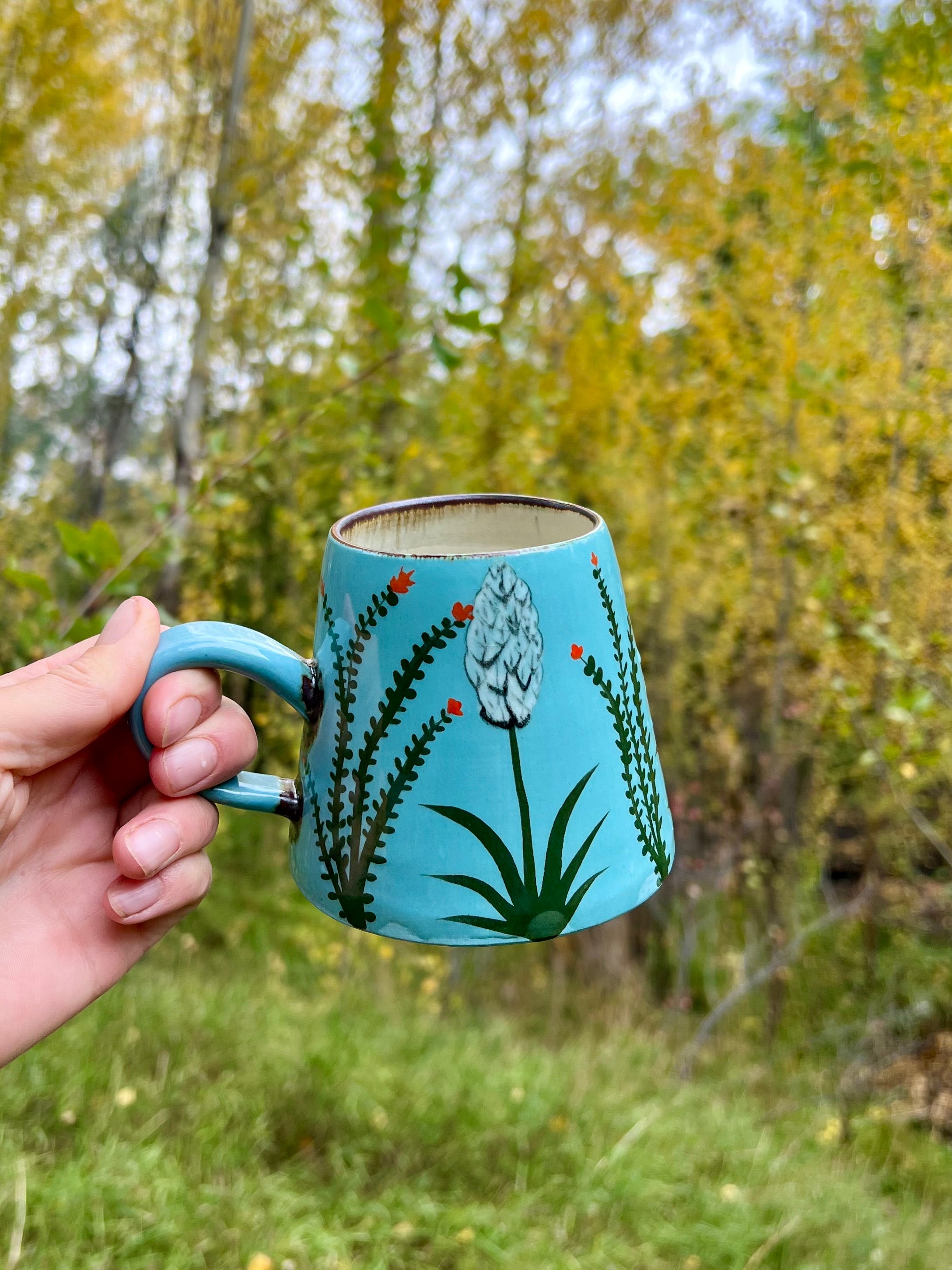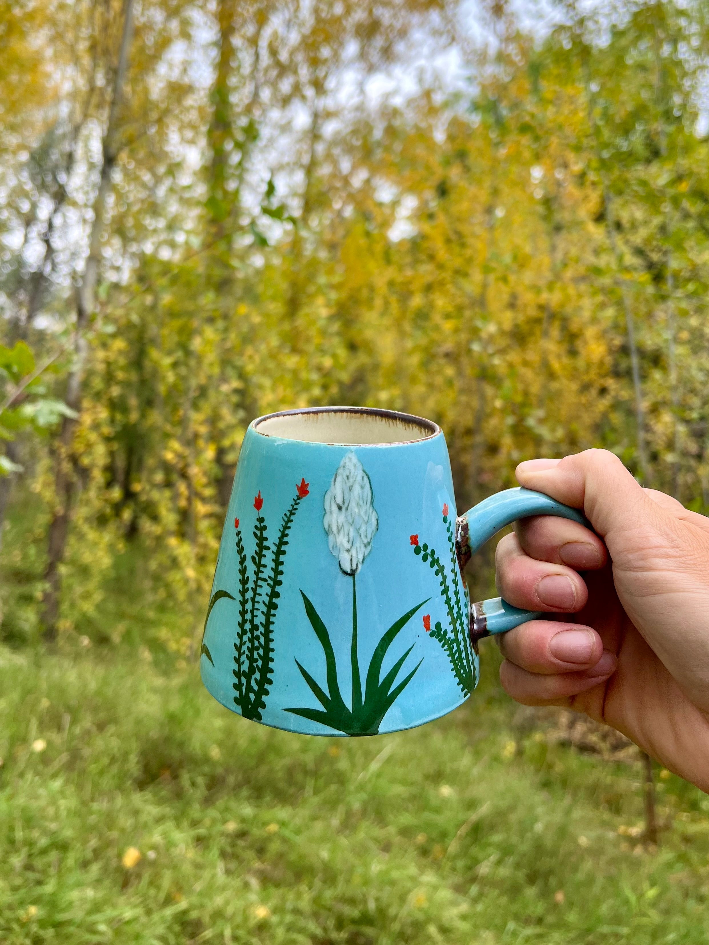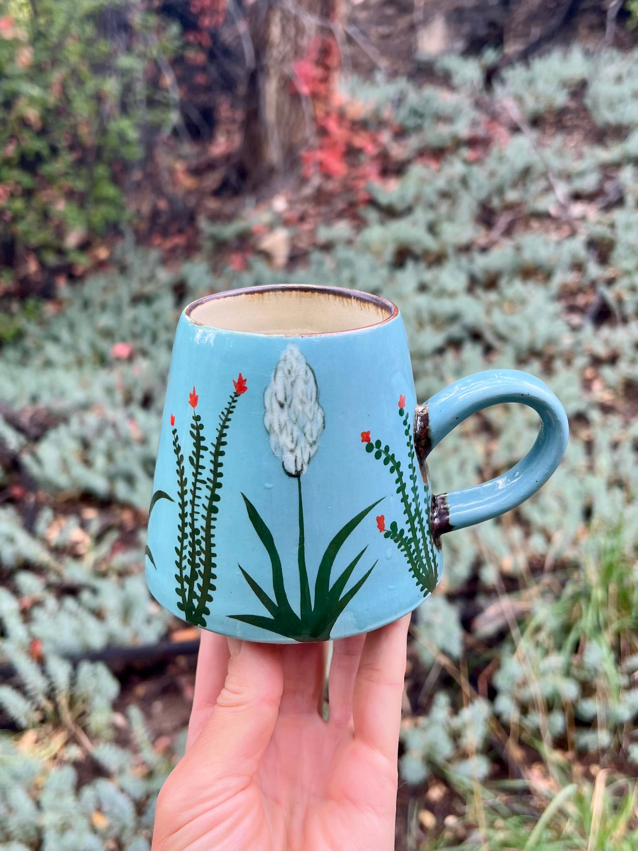 The Blue Sky Yucca & Ocotillo Mug is a wheel-thrown, hand-painted ceramic piece inspired by desert blooms and quiet, sunlit mornings. Its soft blue glaze is adorned with yucca and ocotillo motifs, each brushstroke bringing a touch of warmth and life to the form. The glossy finish highlights the design’s texture, while the yellow salt interior glaze adds a gentle, earthy contrast.