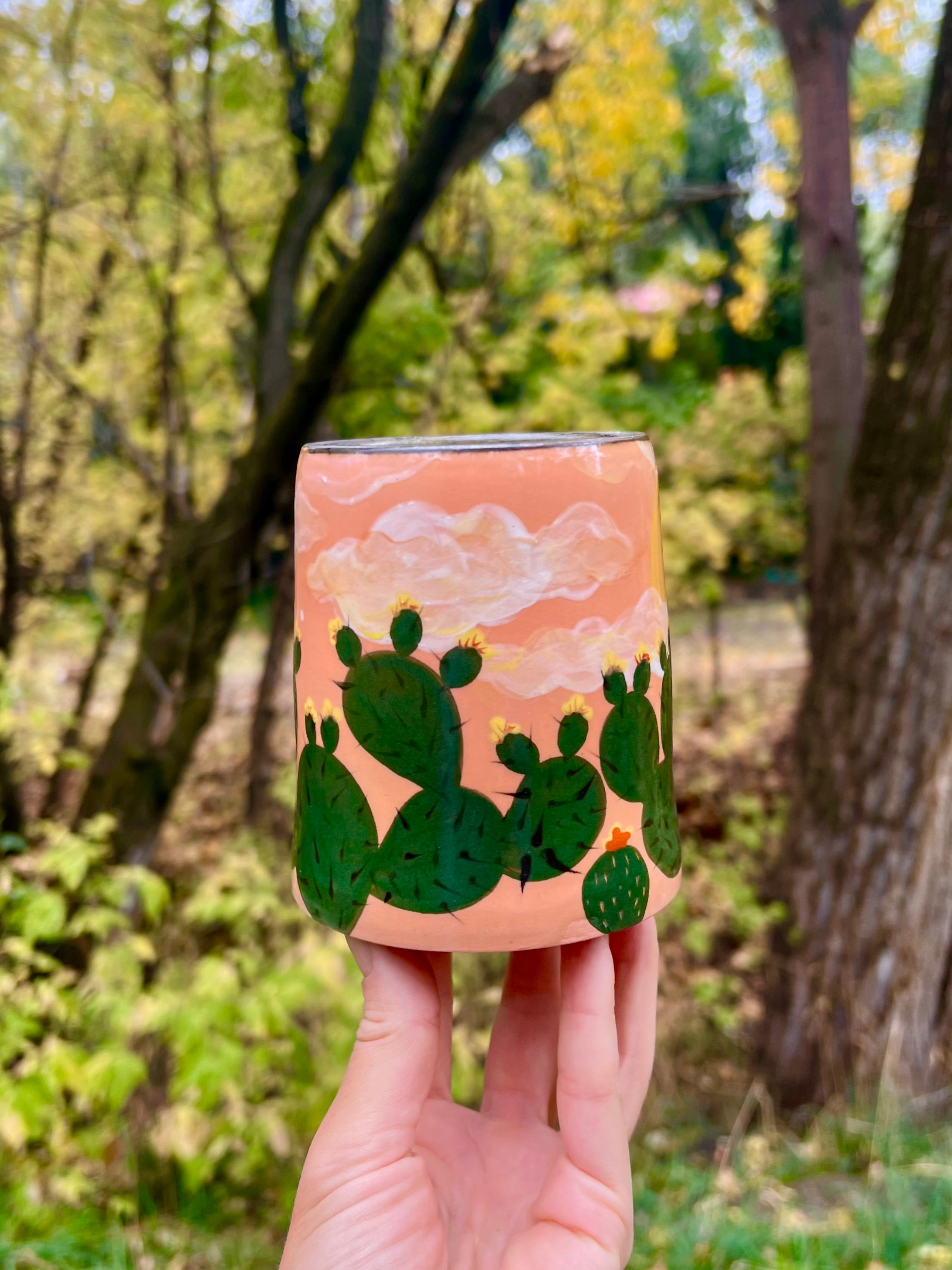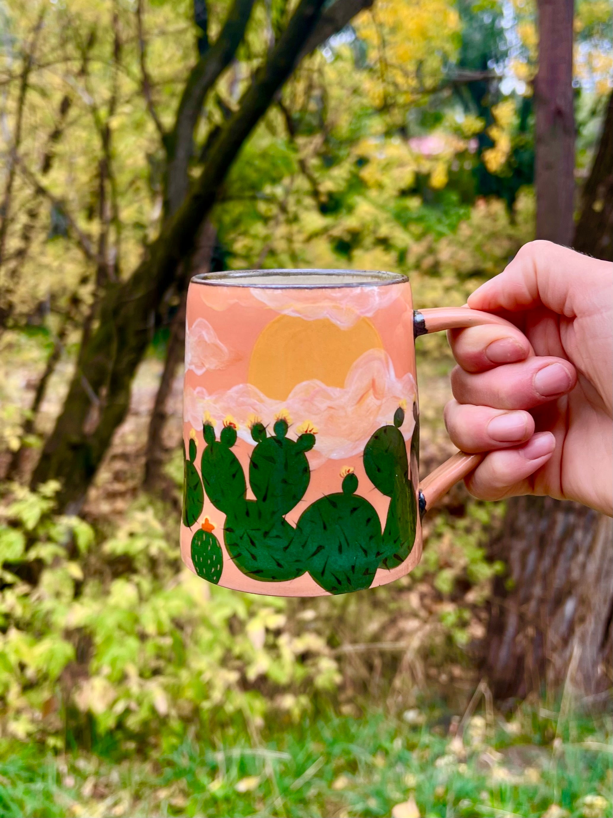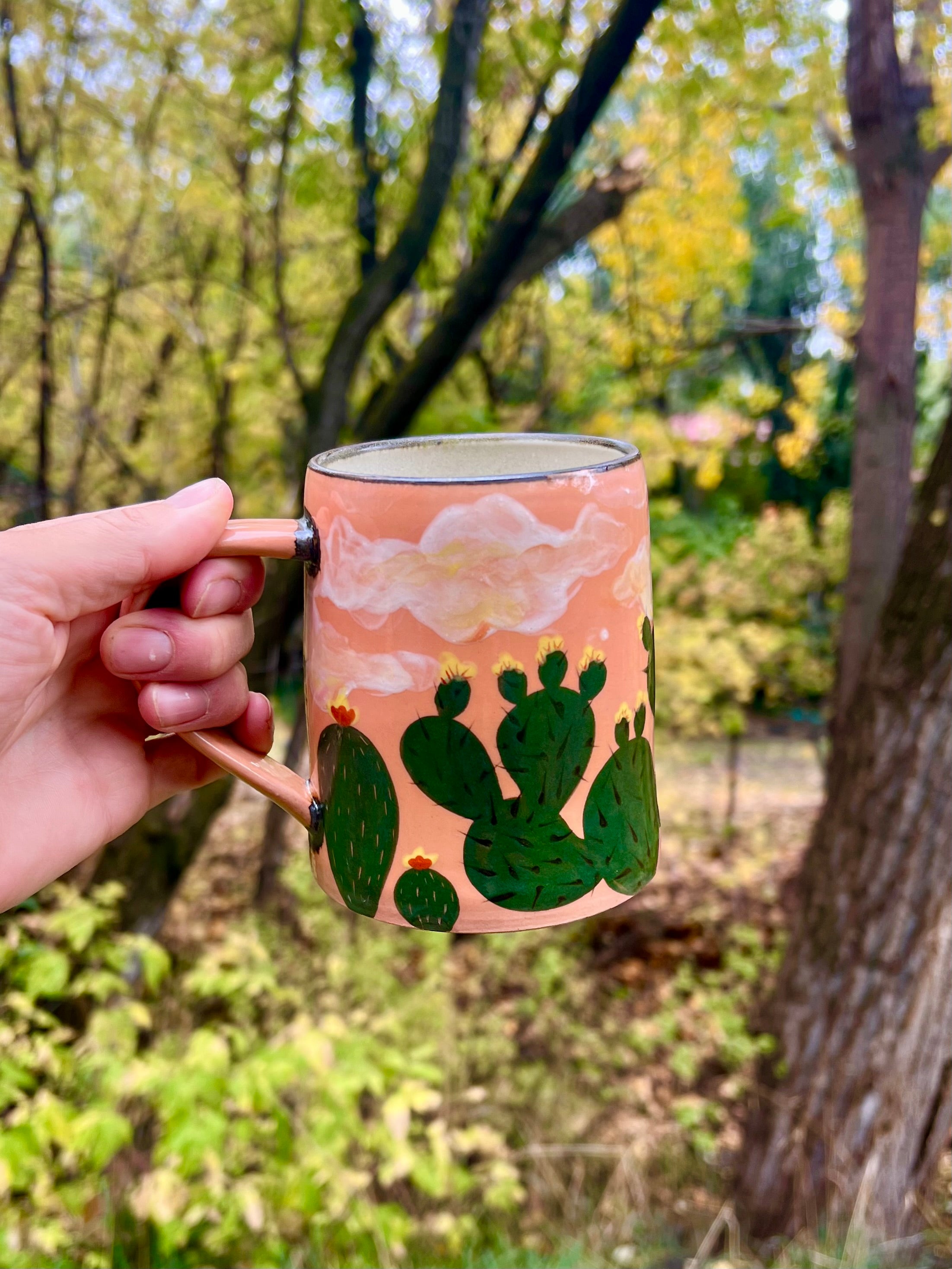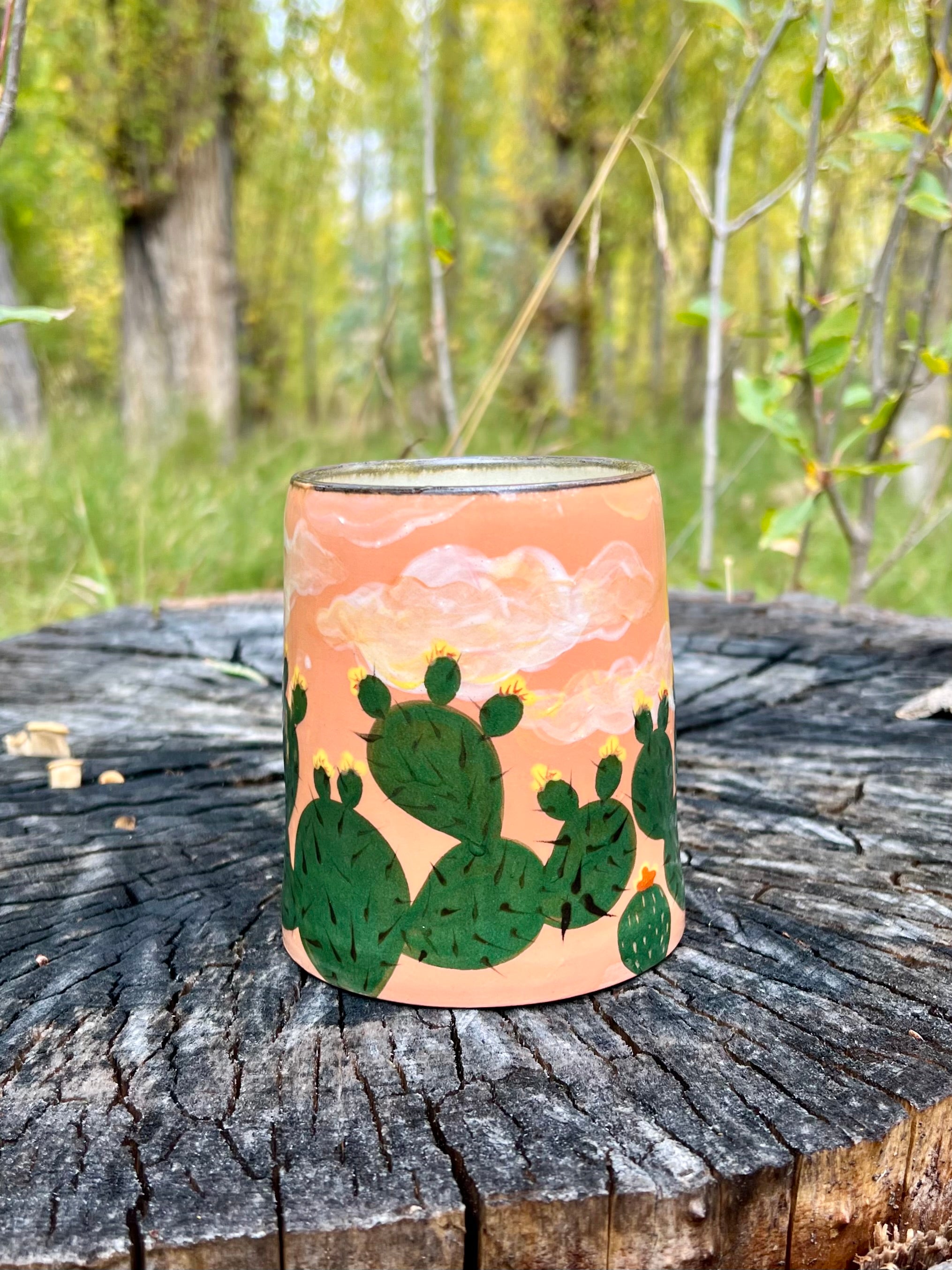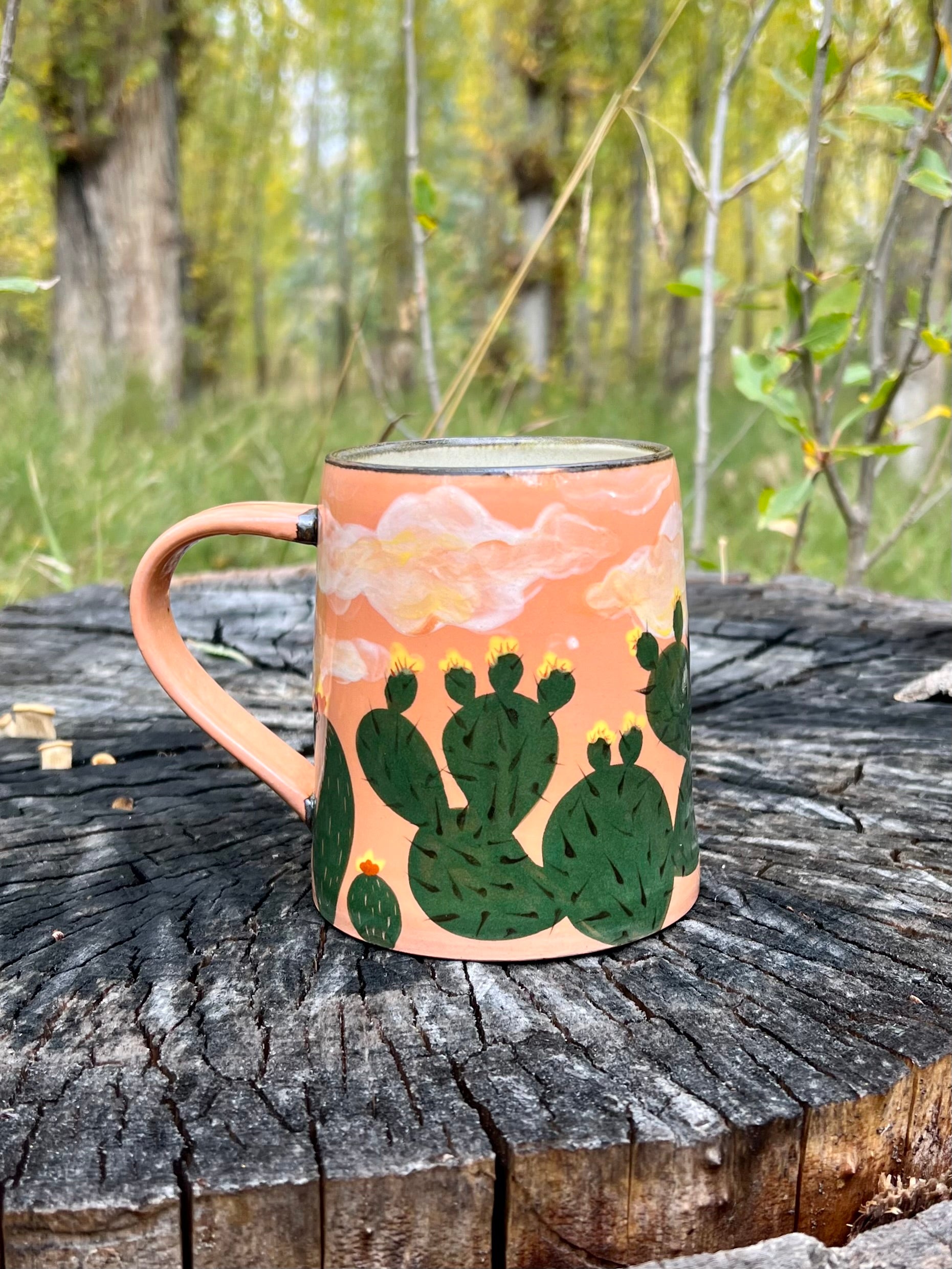 This one-of-a-kind, wheel-thrown mug features a hand-painted desert landscape of lush green prickly pear cacti blooming under a golden sunrise and soft painted clouds. The warm peachy tones and vibrant greens evoke the calm glow of a desert morning.