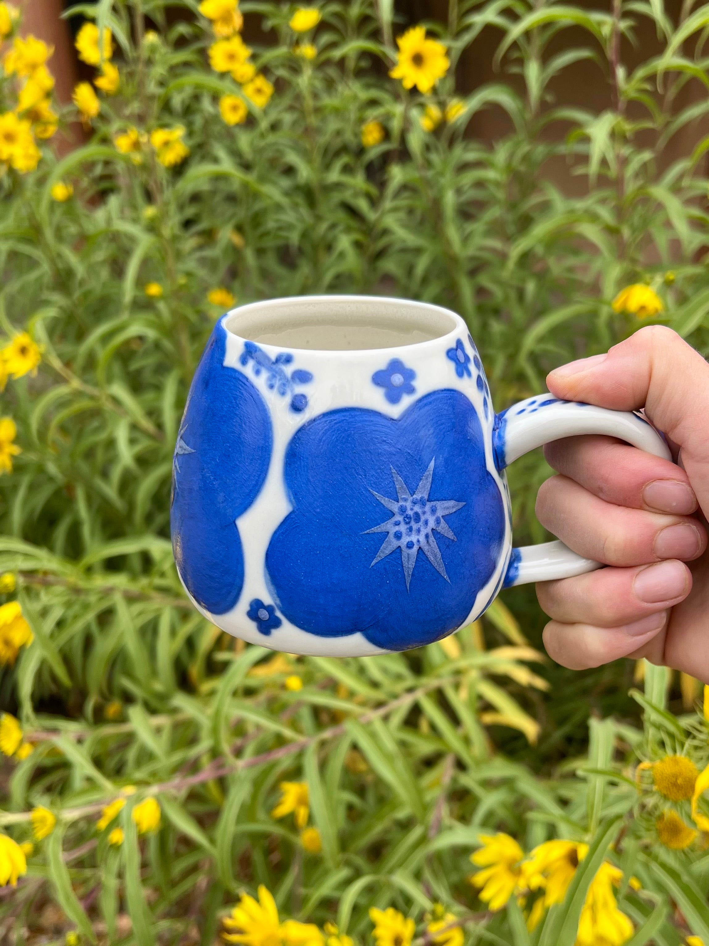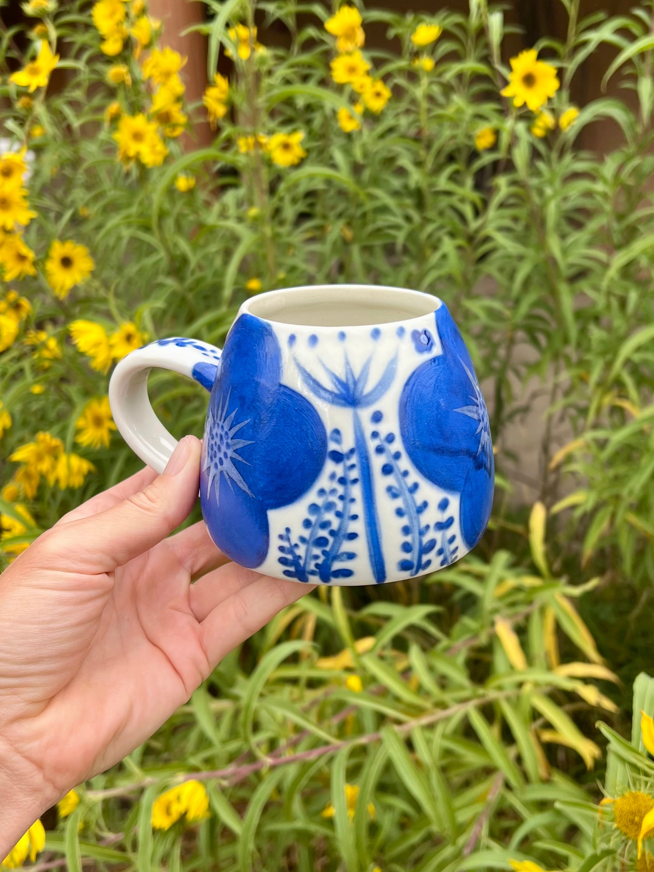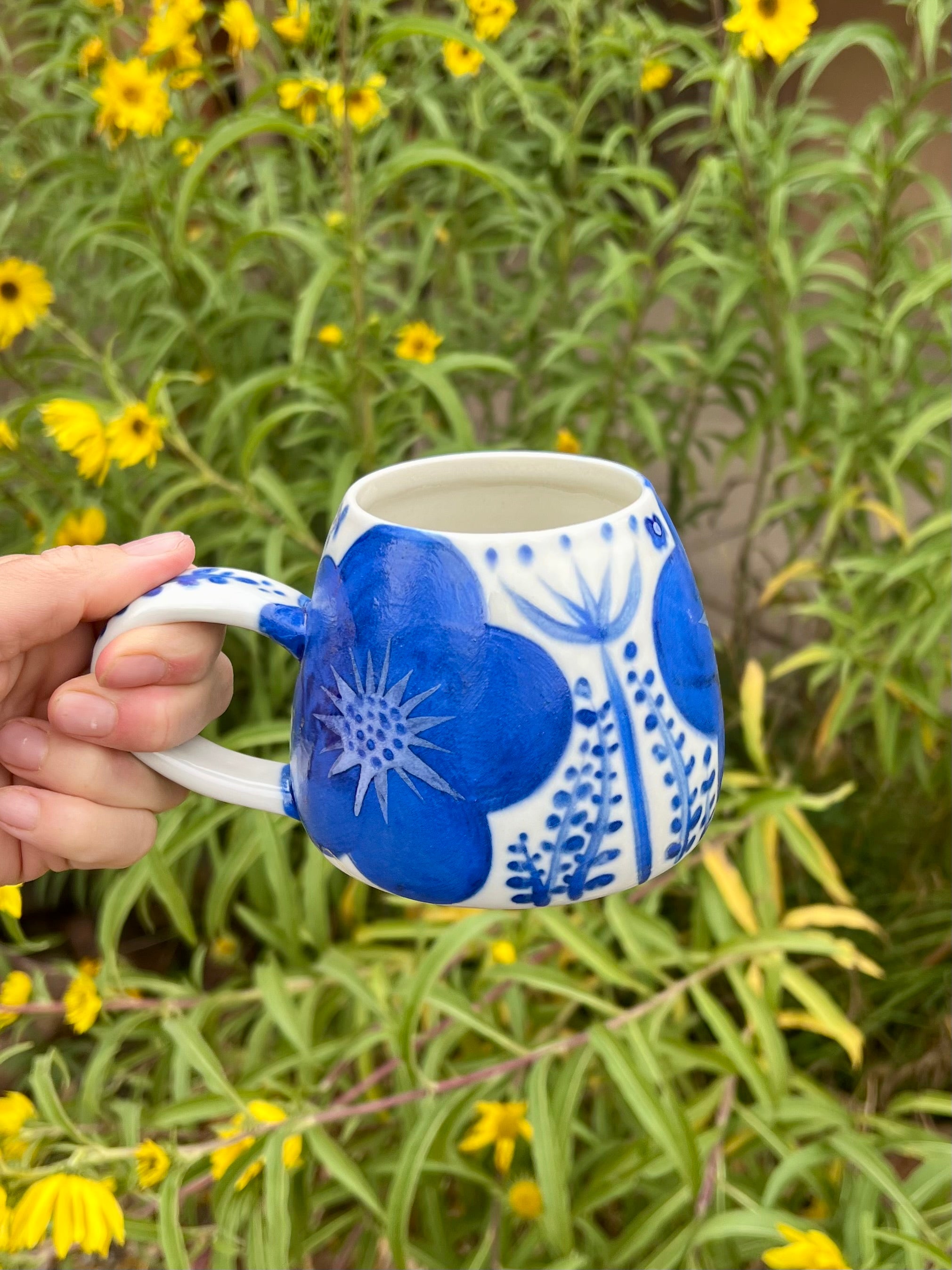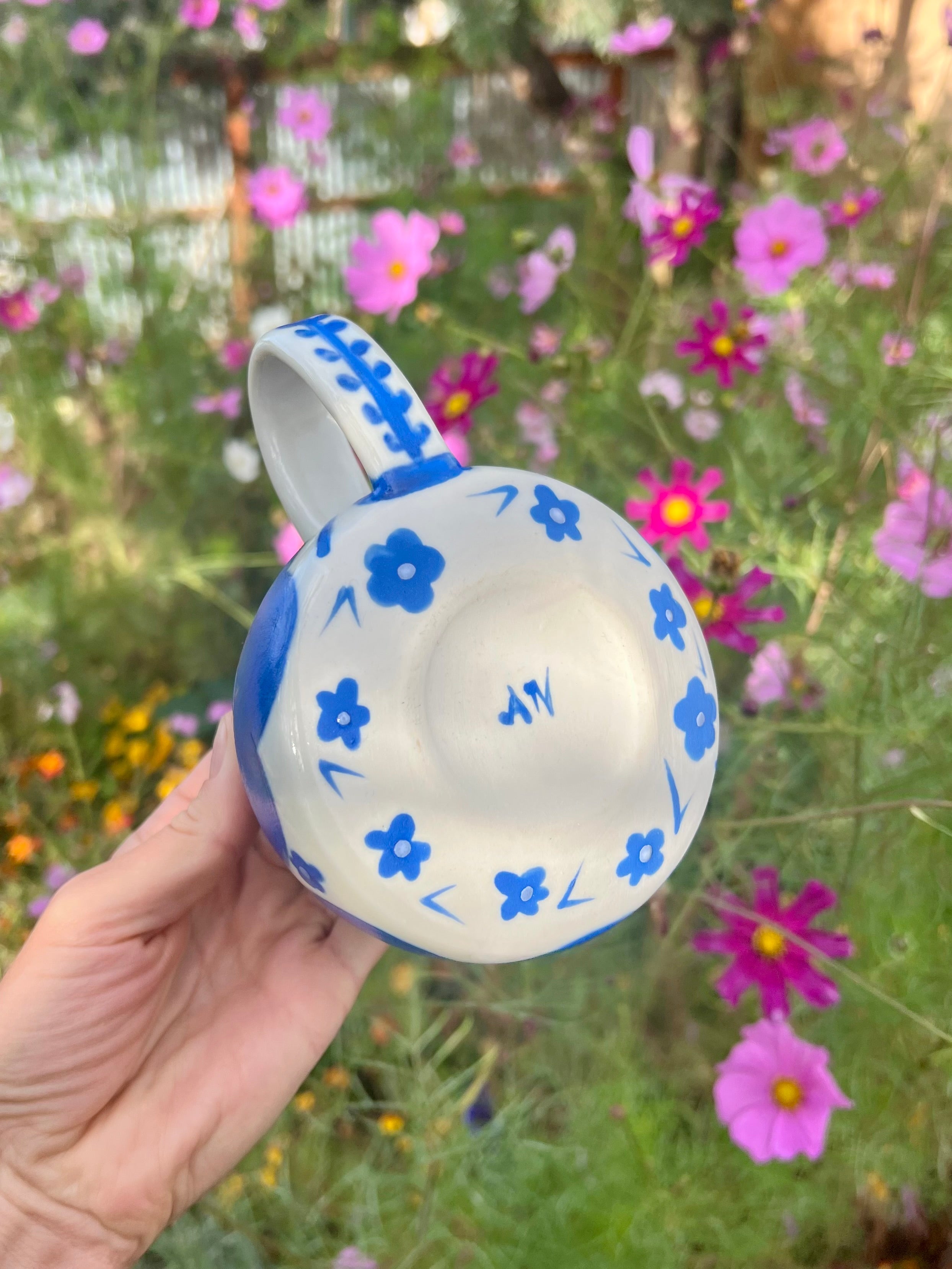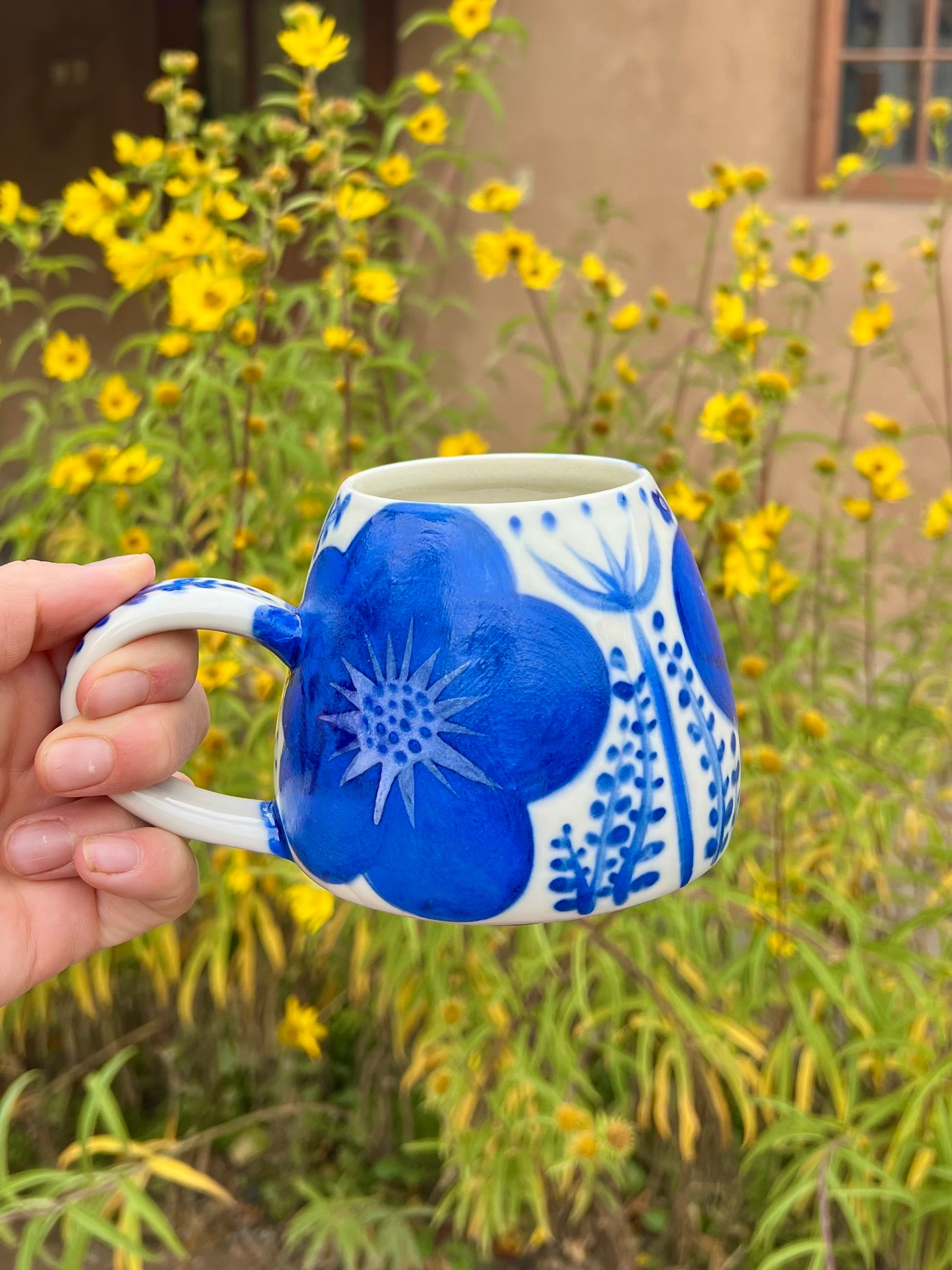 Each mug is thoughtfully wheel-thrown from a high-quality porcelain clay body and hand painted with flowing indigo florals. The smooth white exterior contrasts beautifully with a cream-glazed interior, creating a piece that feels both artful and inviting. Durable enough for everyday use, this mug is microwave and dishwasher safe—crafted for those who appreciate handmade beauty in daily rituals.