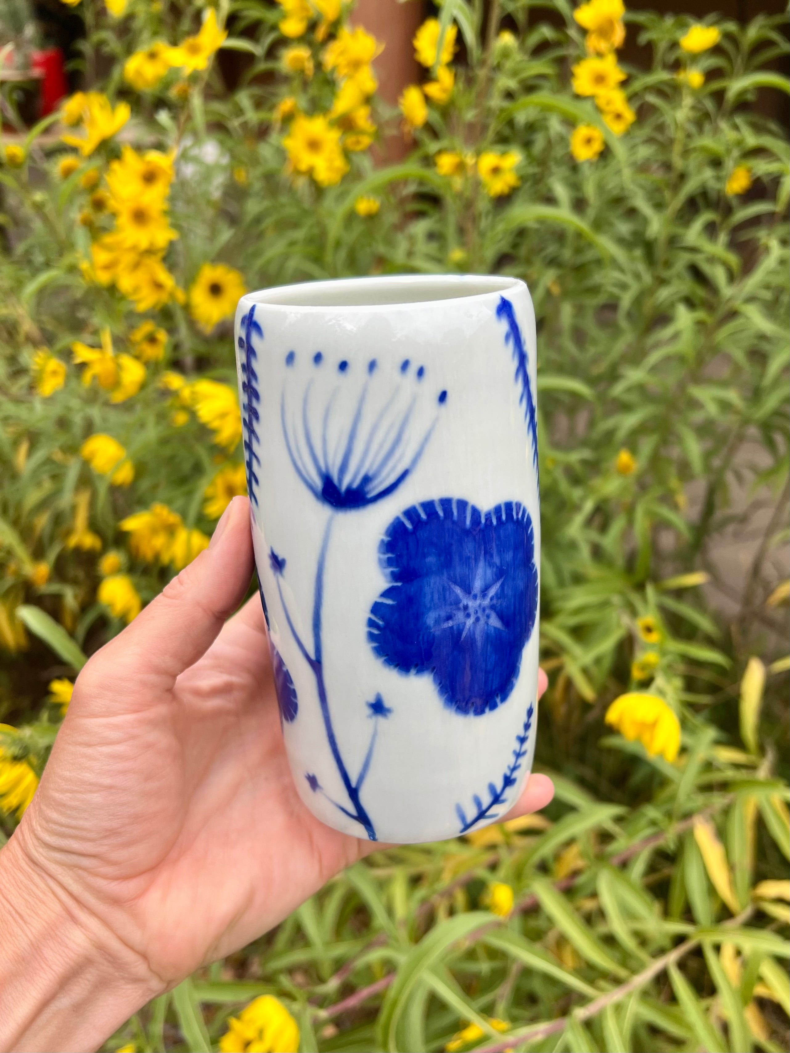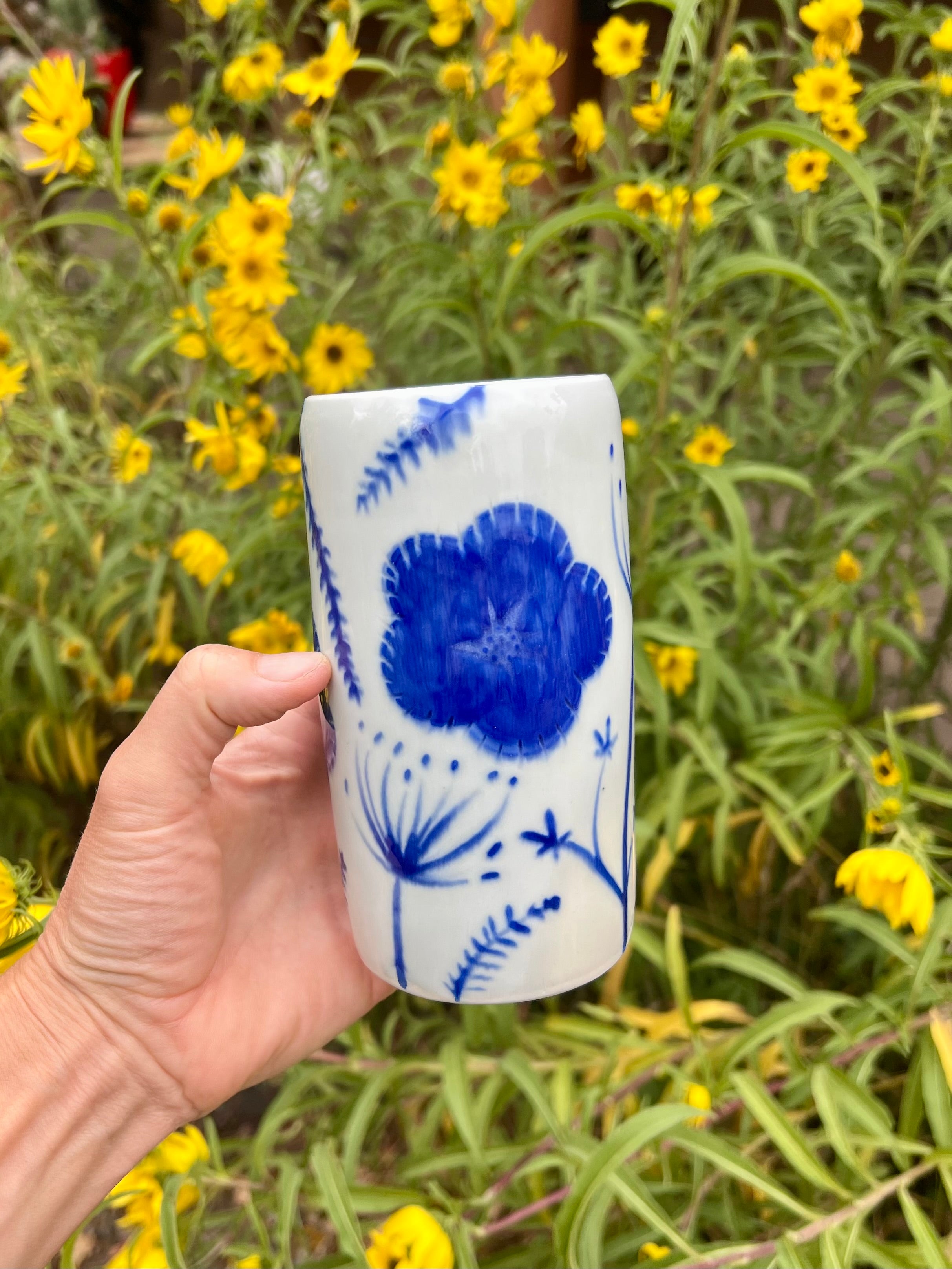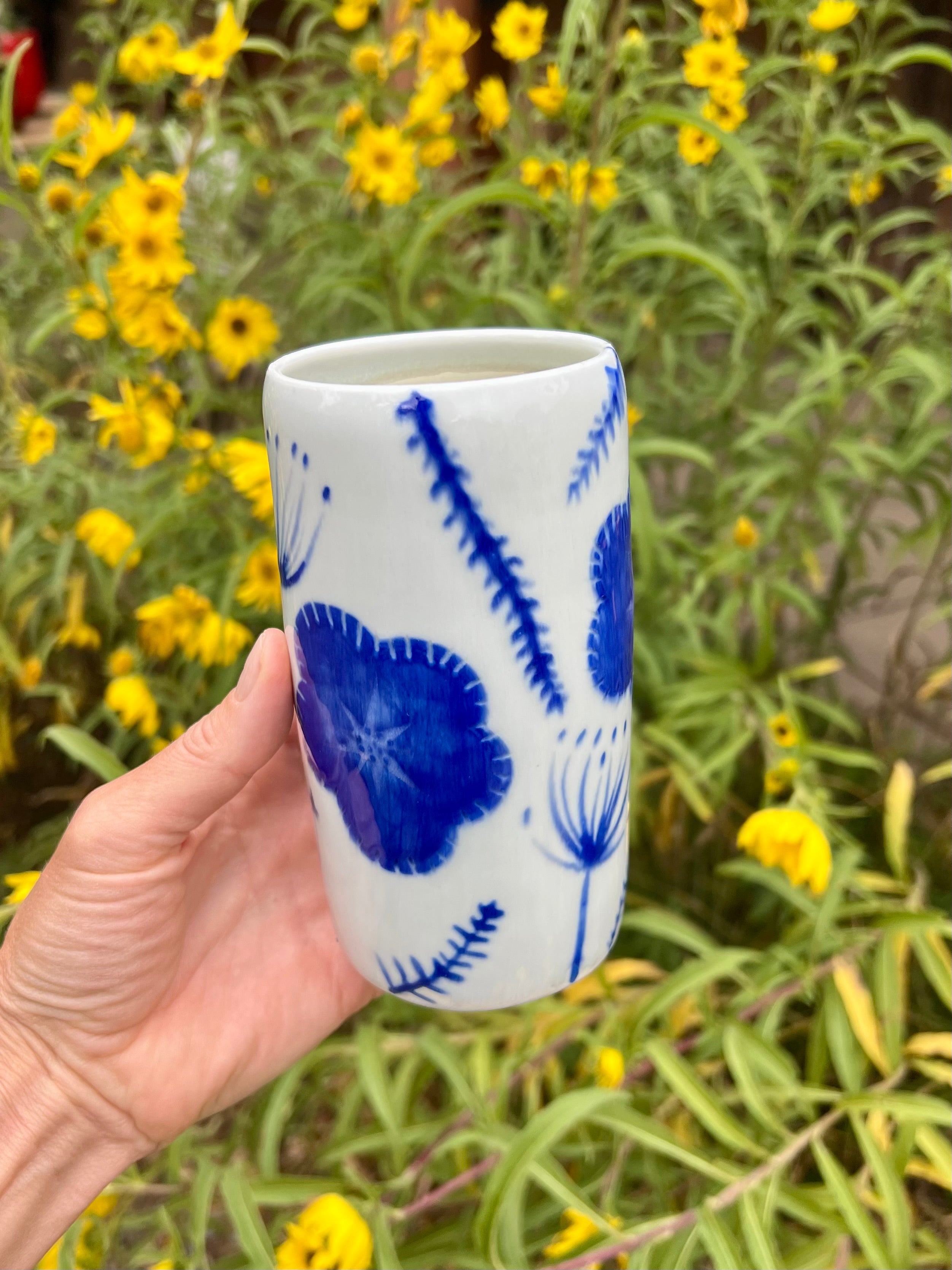 Each mug is thoughtfully wheel-thrown from a high-quality porcelain clay body and hand painted with flowing indigo florals. The smooth white exterior contrasts beautifully with a cream-glazed interior, creating a piece that feels both artful and inviting. Durable enough for everyday use, this mug is microwave and dishwasher safe—crafted for those who appreciate handmade beauty in daily rituals.