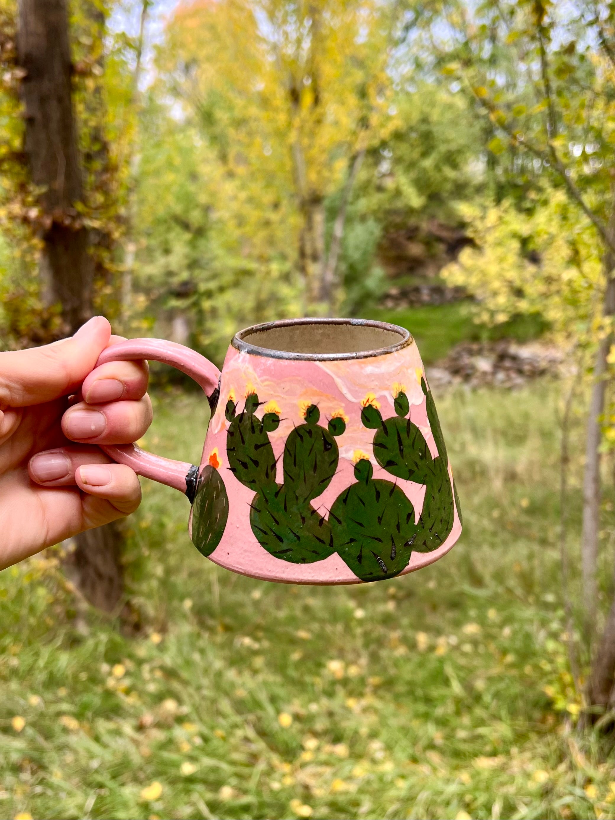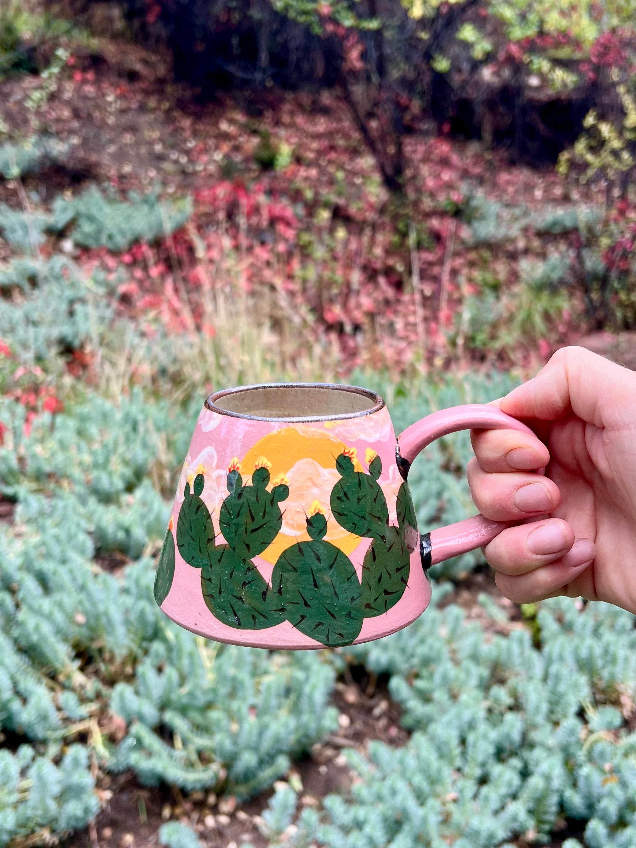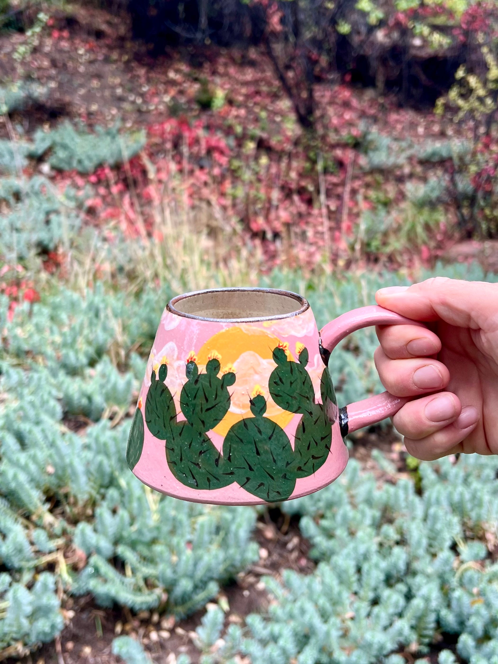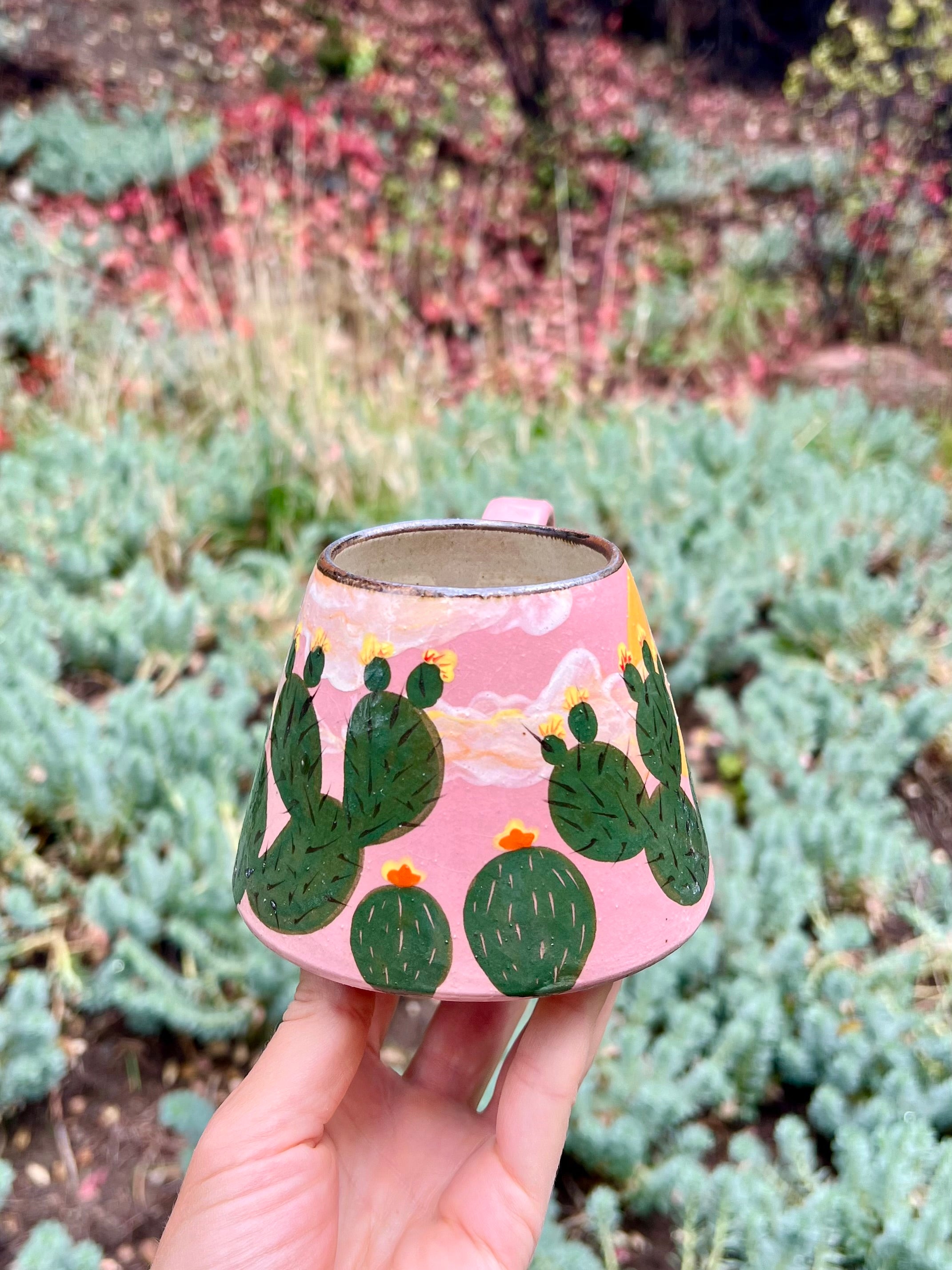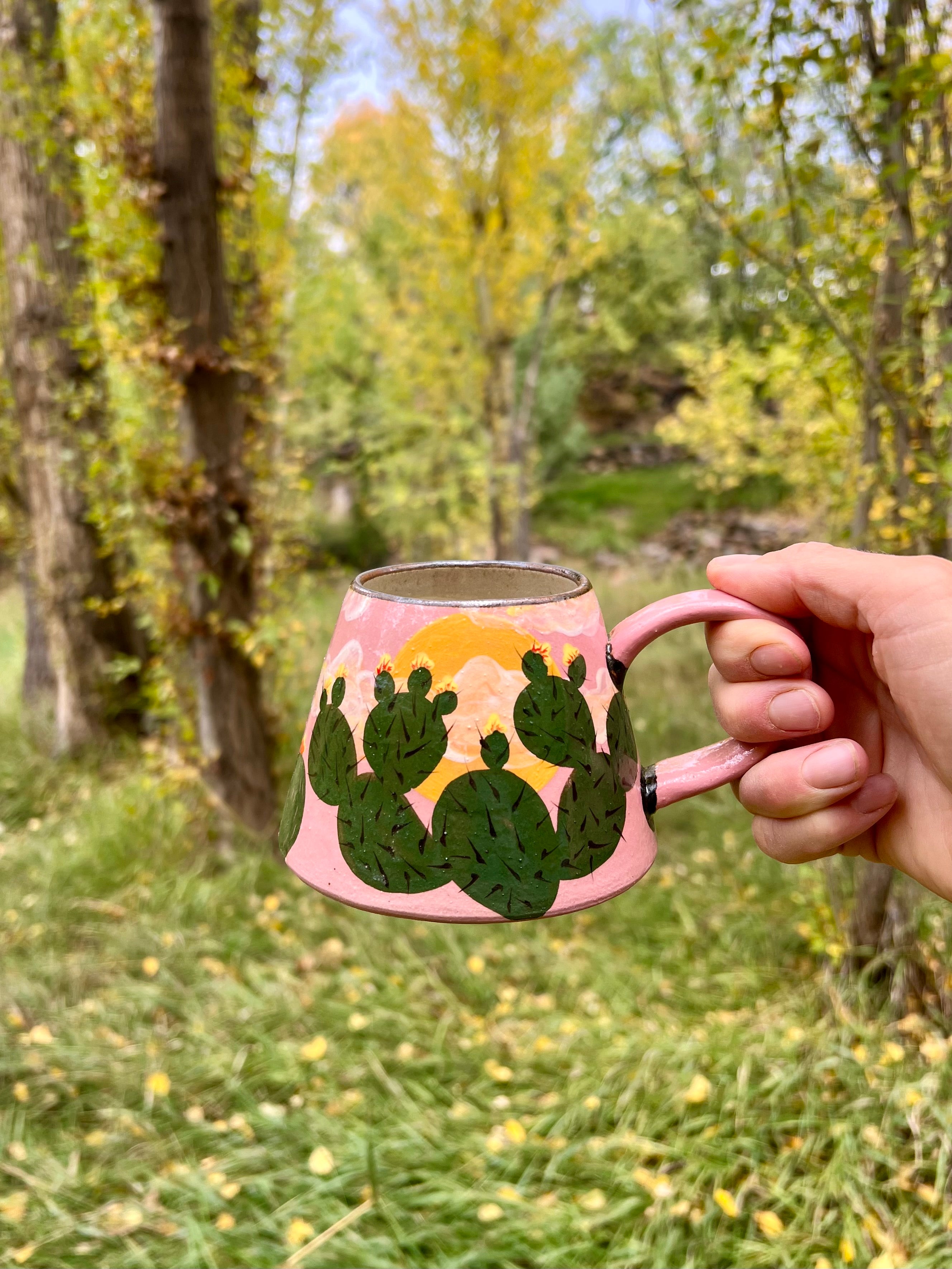 Sip beneath a painted desert sky. This hand-thrown ceramic mug features a lush ring of hand-painted prickly pear cacti blooming against a warm pink backdrop with a glowing golden sun. The design captures that fleeting, magical moment when the desert comes alive with color and light.
