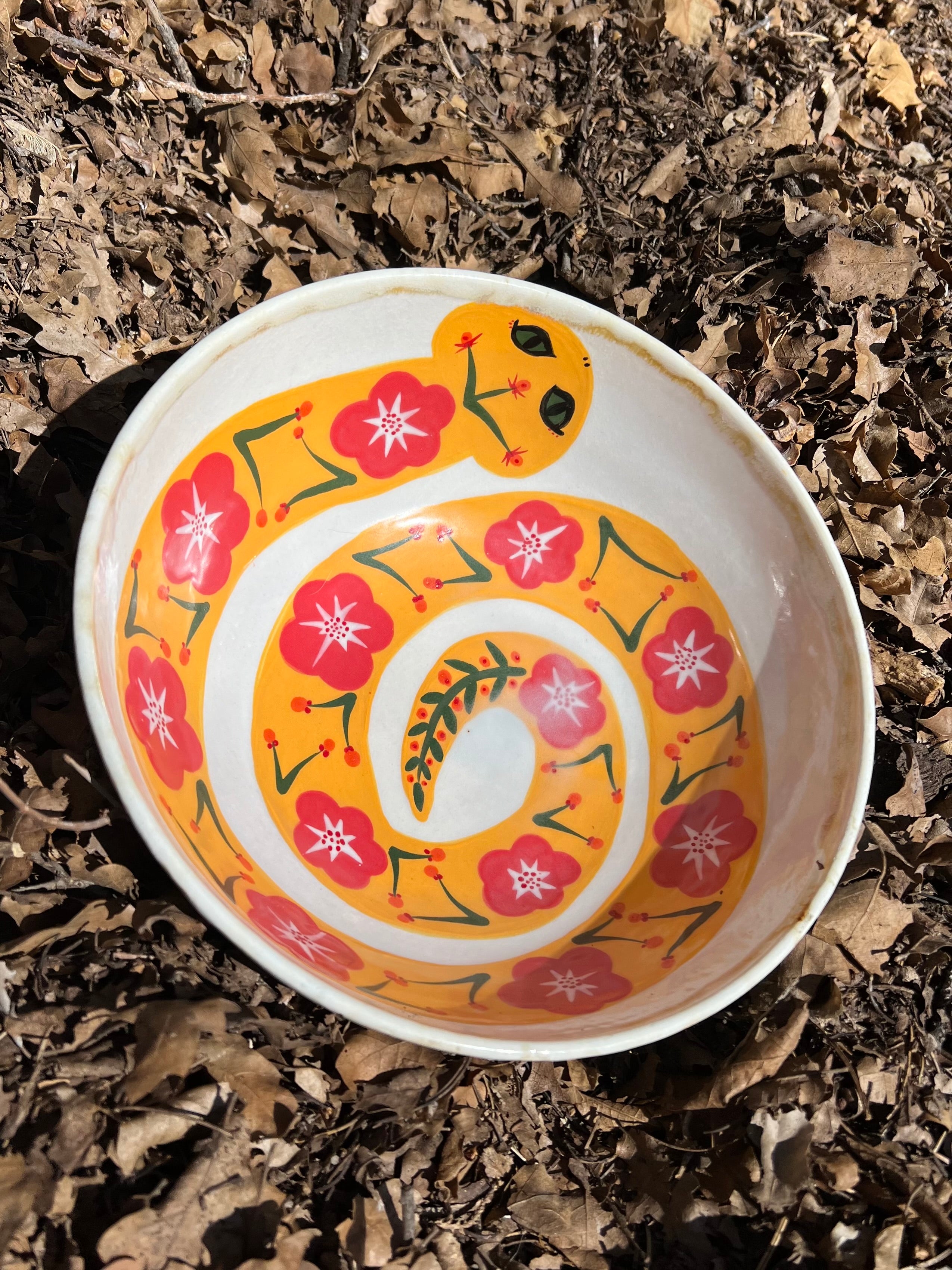 A ceramic serving bowl featuring a hand-painted yellow snake spiraling across a soft white background, accented with red flowers woven through its body.
